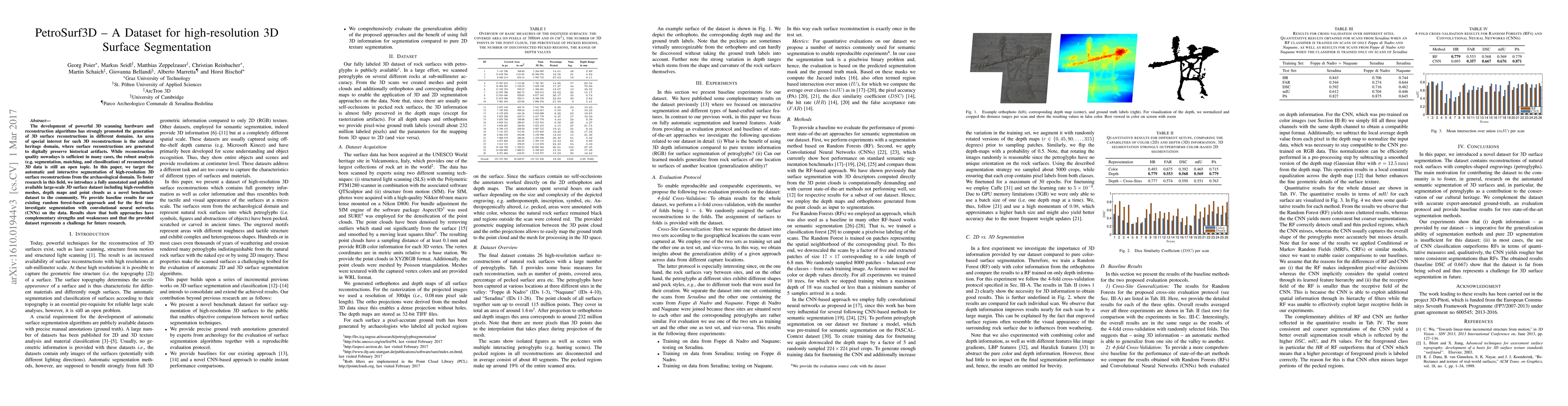The development of powerful 3D scanning hardware and reconstruction algorithms has strongly promoted the generation of 3D surface reconstructions in different domains. An area of special interest for such 3D reconstructions is the cultural heritage domain, where surface reconstructions are generated to digitally preserve historical artifacts. While reconstruction quality nowadays is sufficient in many cases, the robust analysis (e.g. segmentation, matching, and classification) of reconstructed 3D data is still an open topic. In this paper, we target the automatic and interactive segmentation of high-resolution 3D surface reconstructions from the archaeological domain. To foster research in this field, we introduce a fully annotated and publicly available large-scale 3D surface dataset including high-resolution meshes, depth maps and point clouds as a novel benchmark dataset to the community. We provide baseline results for our existing random forest-based approach and for the first time investigate segmentation with convolutional neural networks (CNNs) on the data. Results show that both approaches have complementary strengths and weaknesses and that the provided dataset represents a challenge for future research.