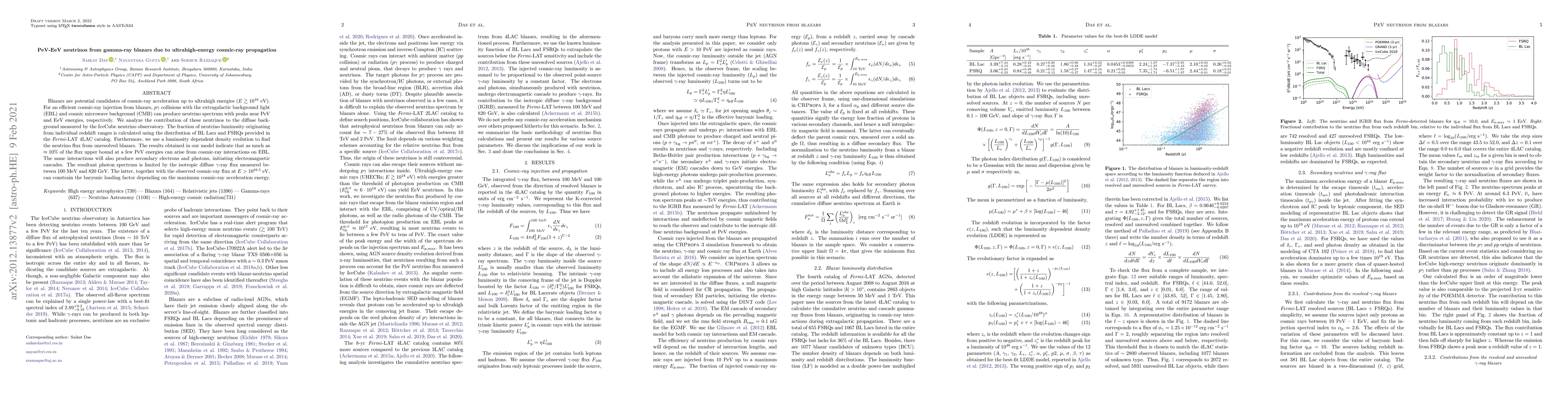Blazars are potential candidates of cosmic-ray acceleration up to ultrahigh energies ($E\gtrsim10^{18}$ eV). For an efficient cosmic-ray injection from blazars, $p\gamma$ collisions with the extragalactic background light (EBL) and cosmic microwave background (CMB) can produce neutrino spectrum peaks near PeV and EeV energies, respectively. We analyze the contribution of these neutrinos to the diffuse background measured by the IceCube neutrino observatory. The fraction of neutrino luminosity originating from individual redshift ranges is calculated using the distribution of BL Lacs and FSRQs provided in the \textit{Fermi}-LAT 4LAC catalog. Furthermore, we use a luminosity dependent density evolution to find the neutrino flux from unresolved blazars. The results obtained in our model indicate that as much as $\approx10\%$ of the flux upper bound at a few PeV energies can arise from cosmic-ray interactions on EBL. The same interactions will also produce secondary electrons and photons, initiating electromagnetic cascades. The resultant photon spectrum is limited by the isotropic diffuse $\gamma$-ray flux measured between 100 MeV and 820 GeV. The latter, together with the observed cosmic-ray flux at $E>10^{16.5}$ eV, can constrain the baryonic loading factor depending on the maximum cosmic-ray acceleration energy.