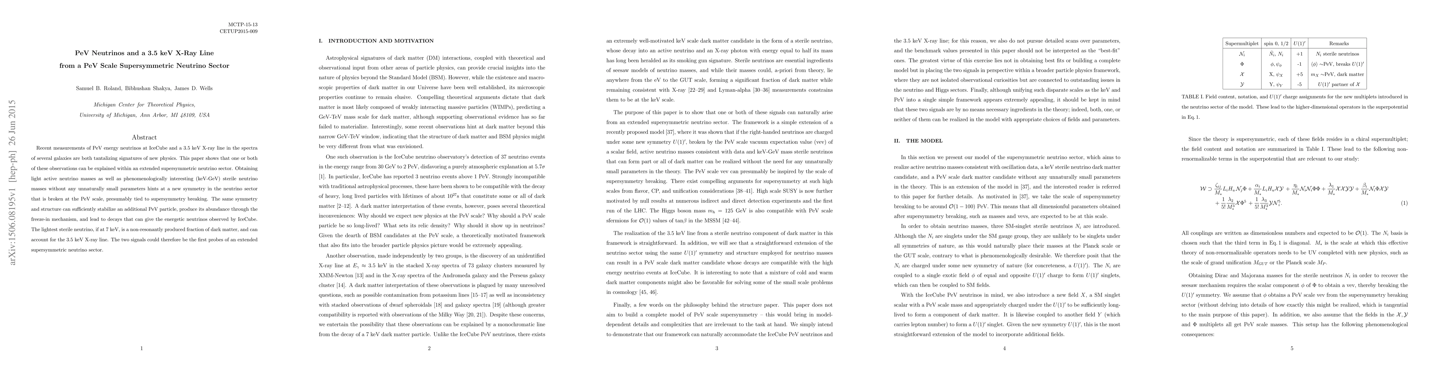 This paper explores how PeV energy neutrinos detected by IceCube and a 3.5 keV X-ray line in galaxy spectra may both arise from an extended supersymmetric neutrino sector. It proposes a new symmetry in the neutrino sector, broken at the PeV scale, which could stabilize a PeV particle and explain both observations.