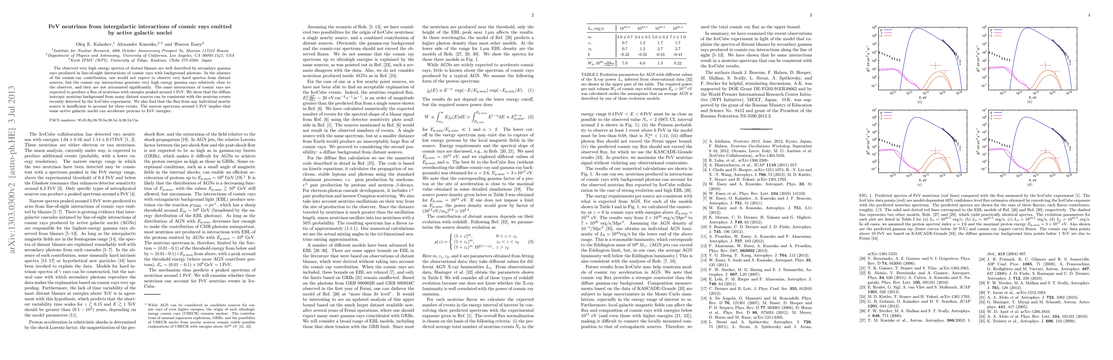 The observed very high energy spectra of distant blazars are well described by secondary gamma rays produced in line-of-sight interactions of cosmic rays with background photons. In the absence of the cosmic-ray contribution, one would not expect to observe very hard spectra from distant sources, but the cosmic ray interactions generate very high energy gamma rays relatively close to the observer, and they are not attenuated significantly. The same interactions of cosmic rays are expected to produce a flux of neutrinos with energies peaked around 1 PeV. We show that the diffuse isotropic neutrino background from many distant sources can be consistent with the neutrino events recently detected by the IceCube experiment. We also find that the flux from any individual nearby source is insufficient to account for these events. The narrow spectrum around 1 PeV implies that some active galactic nuclei can accelerate protons to EeV energies.