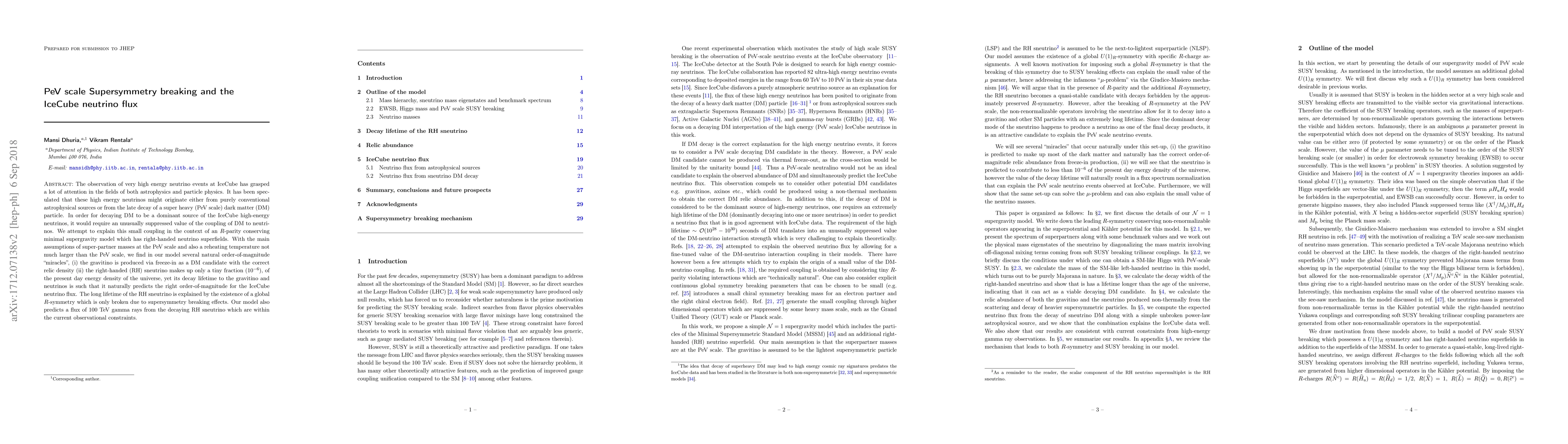 The observation of very high energy neutrino events at IceCube has grasped a lot of attention in the fields of both astrophysics and particle physics. It has been speculated that these high energy neutrinos might originate either from purely conventional astrophysical sources or from the late decay of a super heavy (PeV scale) dark matter (DM) particle. In order for decaying DM to be a dominant source of the IceCube high-energy neutrinos, it would require an unusually suppressed value of the coupling of DM to neutrinos. We attempt to explain this small coupling in the context of an $R$-parity conserving minimal supergravity model which has right-handed neutrino superfields. With the main assumptions of super-partner masses at the PeV scale and also a reheating temperature not much larger than the PeV scale, we find in our model several natural order-of-magnitude "miracles", (i) the gravitino is produced via freeze-in as a DM candidate with the correct relic density (ii) the right-handed (RH) sneutrino makes up only a tiny fraction ($10^{-6})$, of the present day energy density of the universe, yet its decay lifetime to the gravitino and neutrinos is such that it naturally predicts the right order-of-magnitude for the IceCube neutrino flux. The long lifetime of the RH sneutrino is explained by the existence of a global $R$-symmetry which is only broken due to supersymmetry breaking effects. Our model also predicts a flux of 100 TeV gamma rays from the decaying RH sneutrino which are within the current observational constraints.