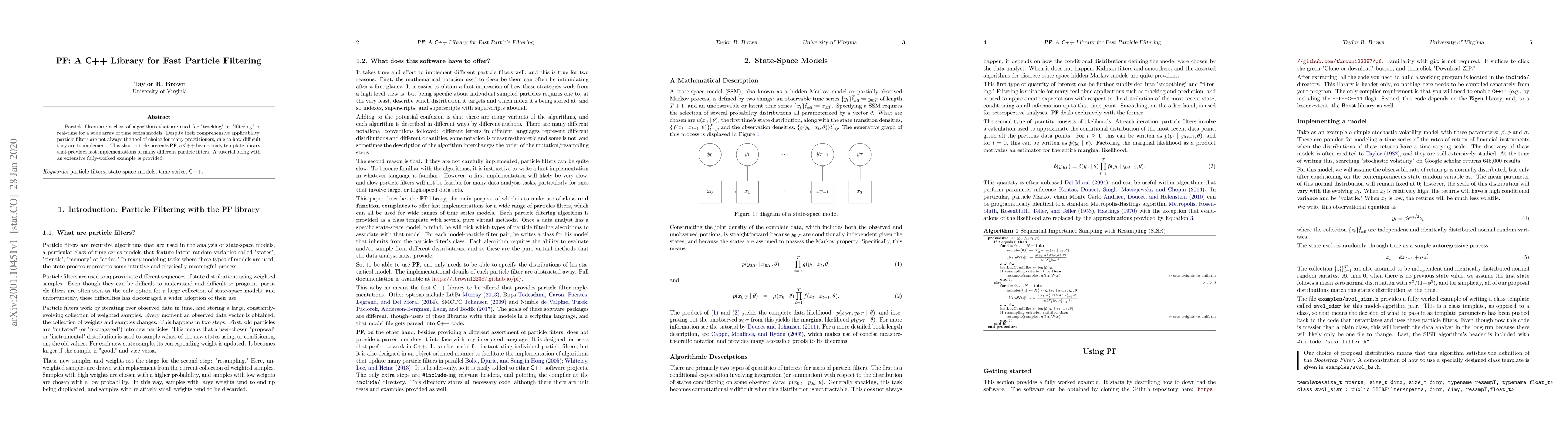 This paper introduces PF, a C++ header-only template library for fast particle filtering, aimed at simplifying the implementation of particle filters for various time series models. The library includes a tutorial and a fully-worked example to facilitate user understanding.
