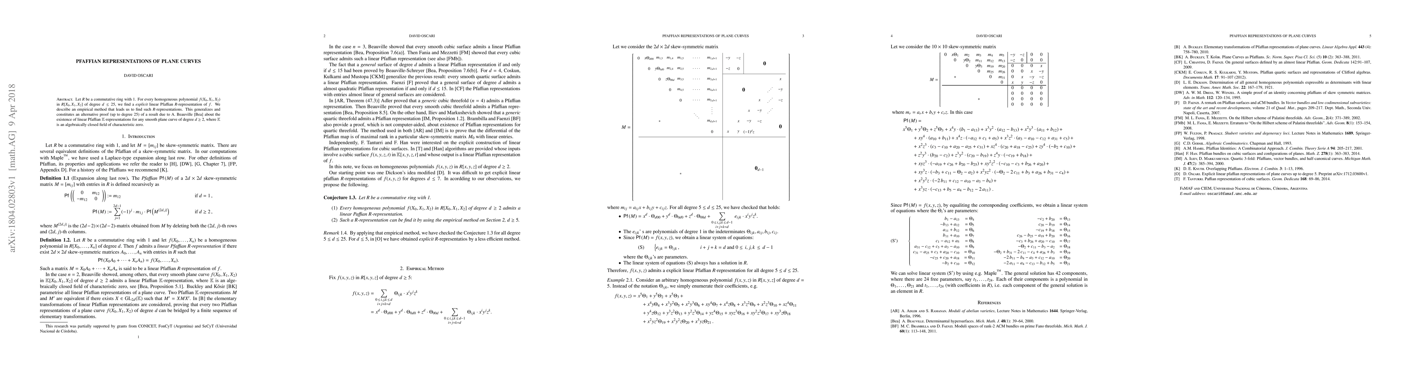Let R be a commutative ring with 1. For every homogeneous polynomial f(X_0,X_1,X_2) in R[X_0,X_1,X_2] of degree d <= 25, we find a explicit linear Pfaffian R-representation of f. We describe an empirical method that leads us to find such R-representations. This generalizes and constitutes an alternative proof (up to degree 25) of a result due to A. Beauville [Bea] about the existence of linear Pfaffian K-representations for any smooth plane curve of degree d >= 2, where K is an algebraically closed field of characteristic zero.