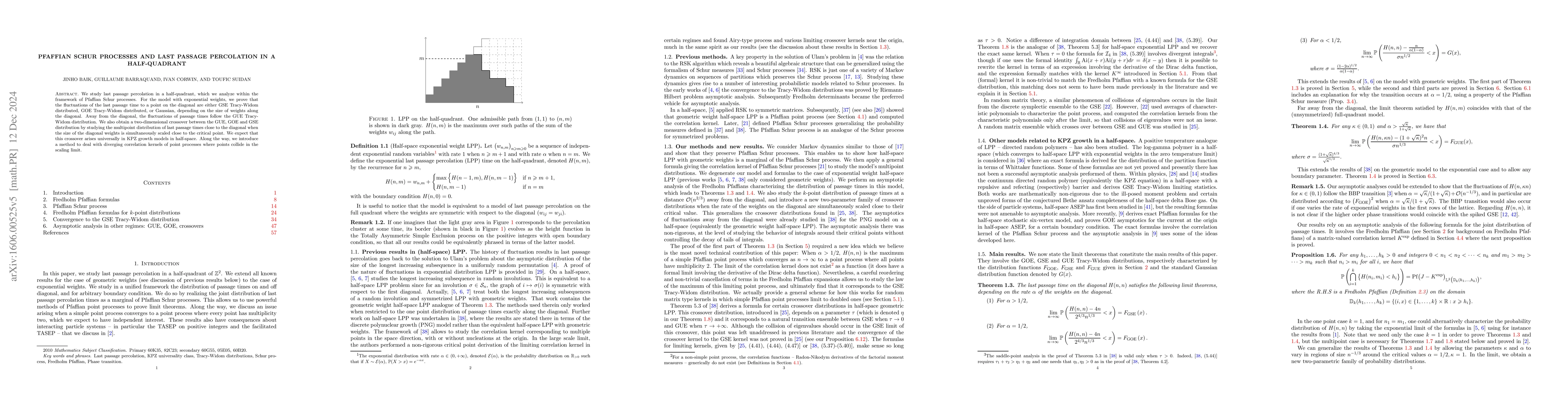 This paper investigates last passage percolation in a half-quadrant using Pfaffian Schur processes, revealing fluctuations in last passage times that follow GSE, GOE, or Gaussian distributions depending on weight sizes. A two-dimensional crossover between GUE, GOE, and GSE distributions is observed near the diagonal, suggesting universal behavior in KPZ growth models.