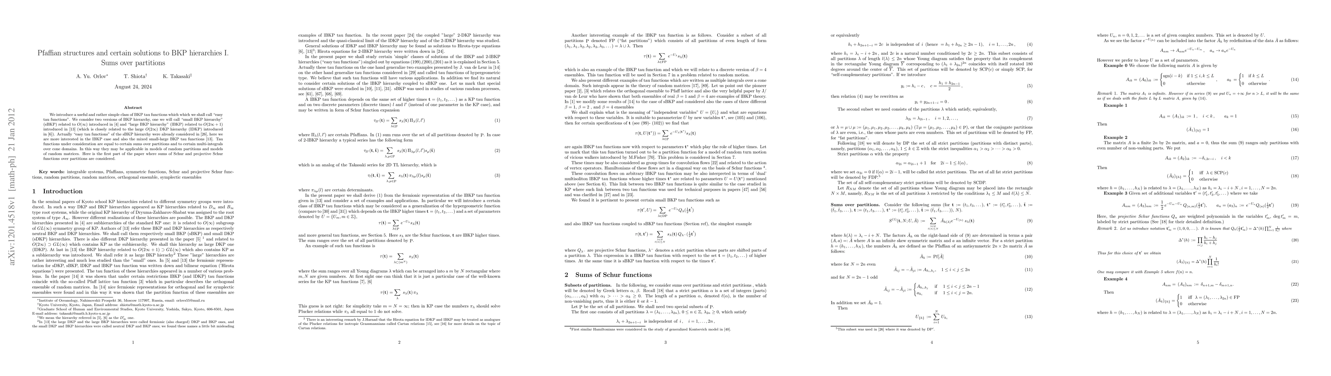 We introduce a useful and rather simple class of BKP tau functions which which we shall call "easy tau functions". We consider two versions of BKP hierarchy, one we will call "small BKP hierarchy" (sBKP) related to $O(\infty)$ introduced in Date et al and "large BKP hierarchy" (lBKP) related to $O(2\infty +1)$ introduced in Kac and van de Leur (which is closely related to the large $O(2\infty)$ DKP hierarchy (lDKP) introduced in Jimbo and Miwa). Actually "easy tau functions" of the sBKP hierarchy were already considered in Harnad et al, here we are more interested in the lBKP case and also the mixed small-large BKP tau functions (Kac and van de Leur). Tau functions under consideration are equal to certain sums over partitions and to certain multi-integrals over cone domains. In this way they may be applicable in models of random partitions and models of random matrices. Here is the first part of the paper where sums of Schur and projective Schur functions over partitions are considered.