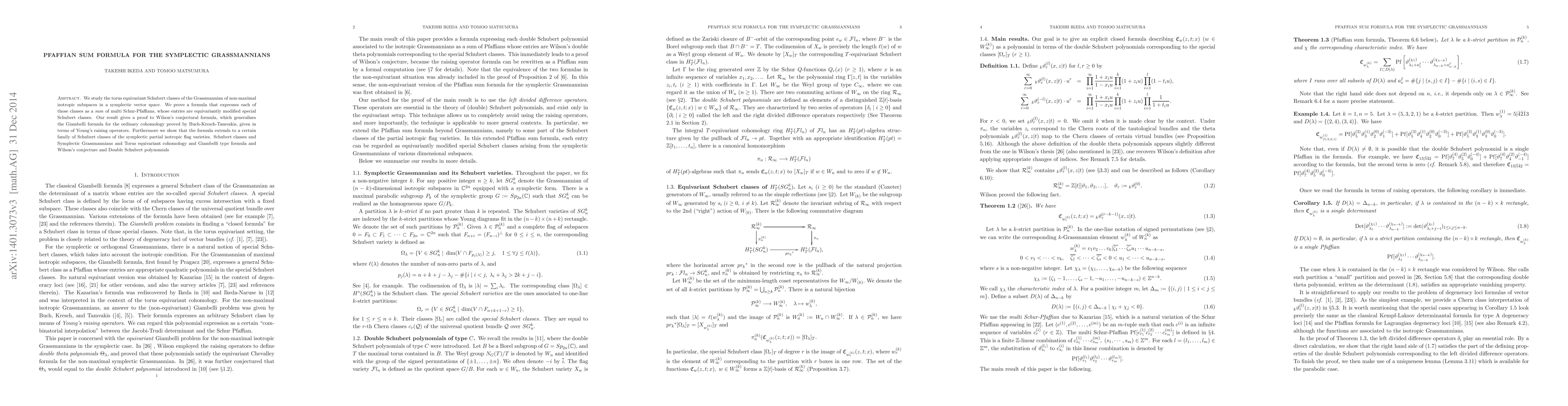 This paper proves a formula expressing torus equivariant Schubert classes in symplectic Grassmannians as sums of multi Schur-Pfaffians, confirming Wilson's conjecture and extending the Giambelli formula. The result also applies to a family of Schubert classes in symplectic partial isotropic flag varieties.