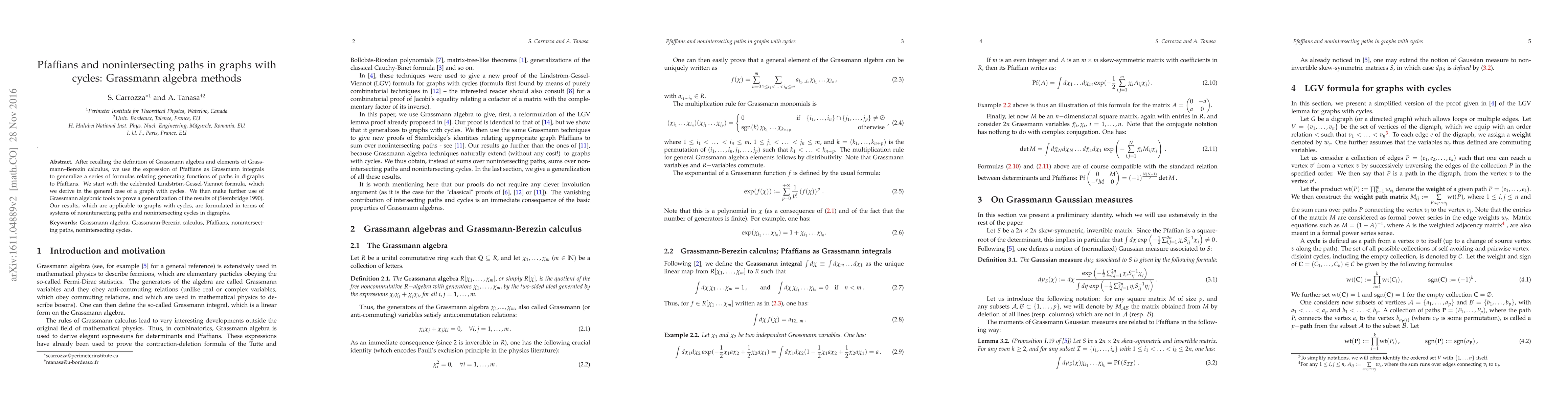This paper utilizes Grassmann algebra and Berezin calculus to generalize formulas relating generating functions of paths in graphs with cycles to Pfaffians, extending the Lindström-Gessel-Viennot theorem and providing new results for systems of nonintersecting paths and cycles in digraphs.
