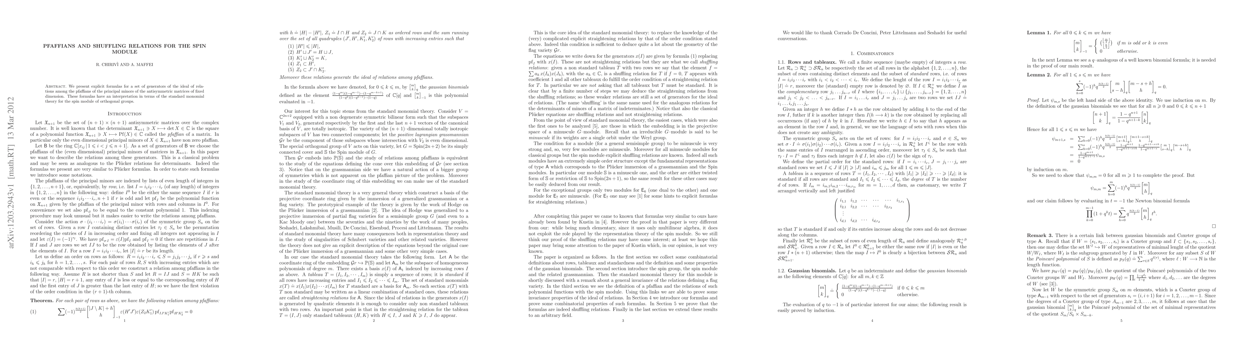 This paper provides explicit formulas for the ideal of relations among pfaffians of antisymmetric matrices, interpreted through the standard monomial theory for the spin module of orthogonal groups. The results elucidate shuffling relations in the context of spin modules.