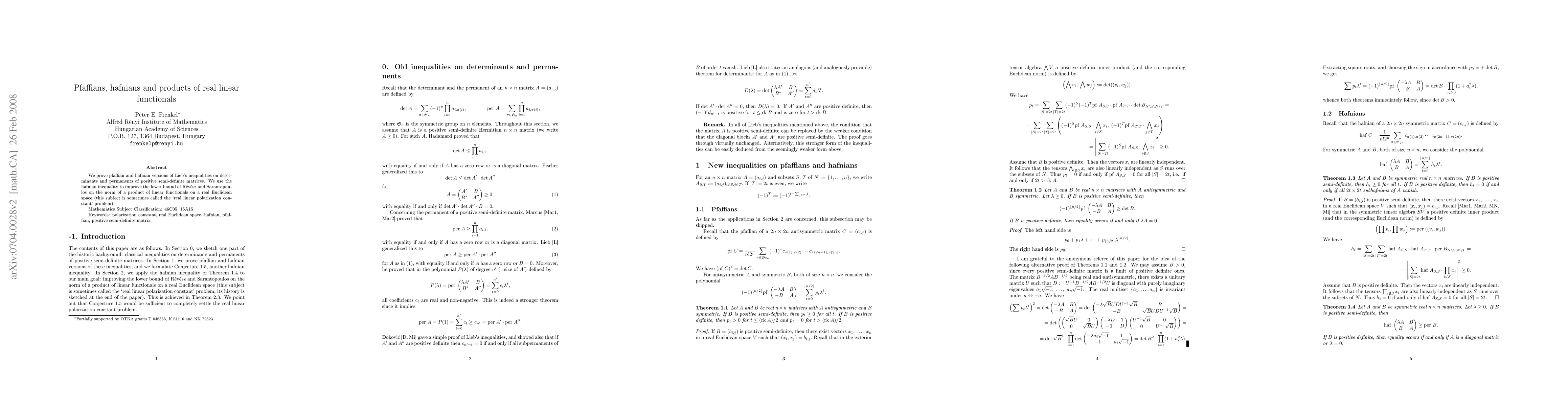 We prove pfaffian and hafnian versions of Lieb's inequalities on determinants and permanents of positive semi-definite matrices. We use the hafnian inequality to improve the lower bound of R\'ev\'esz and Sarantopoulos on the norm of a product of linear functionals on a real Euclidean space (this subject is sometimes called the `real linear polarization constant' problem).