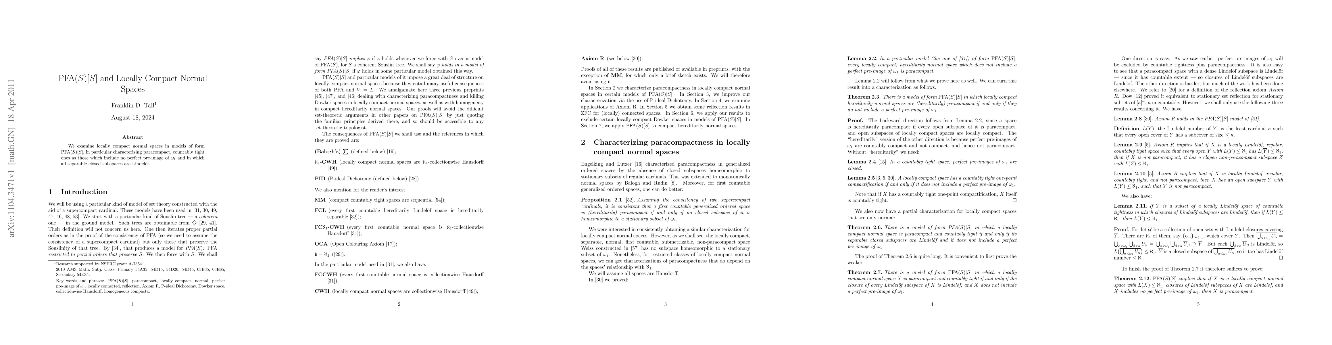 Summary: The paper investigates locally compact normal spaces in models of PFA(S)[S], identifying those that are paracompact and countably tight by the absence of perfect pre-images of omega_1 and the Lindelof property of all separable closed subspaces.
