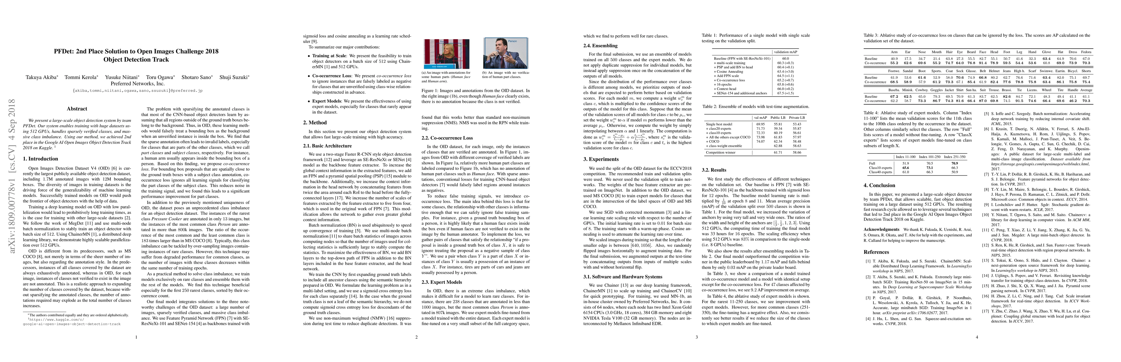 Summary: PFDet developed a large-scale object detection system that utilized 512 GPUs to handle vast datasets and class imbalance, securing 2nd place in the 2018 Google AI Open Images Challenge on Kaggle. The system effectively managed sparsely verified classes.
