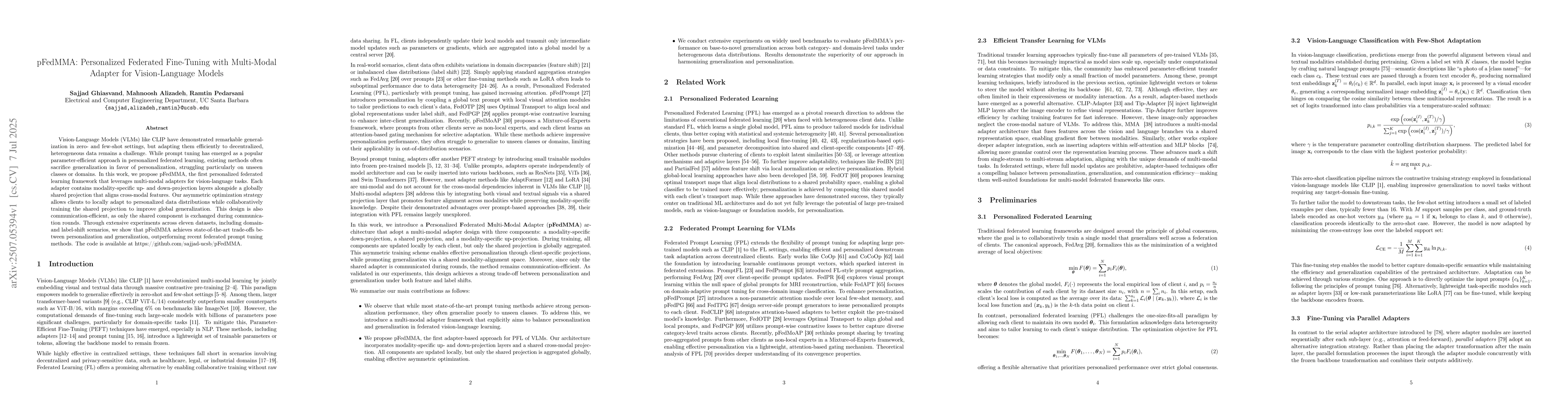 Vision-Language Models (VLMs) like CLIP have demonstrated remarkable generalization in zero- and few-shot settings, but adapting them efficiently to decentralized, heterogeneous data remains a challenge. While prompt tuning has emerged as a popular parameter-efficient approach in personalized federated learning, existing methods often sacrifice generalization in favor of personalization, struggling particularly on unseen classes or domains. In this work, we propose pFedMMA, the first personalized federated learning framework that leverages multi-modal adapters for vision-language tasks. Each adapter contains modality-specific up- and down-projection layers alongside a globally shared projection that aligns cross-modal features. Our asymmetric optimization strategy allows clients to locally adapt to personalized data distributions while collaboratively training the shared projection to improve global generalization. This design is also communication-efficient, as only the shared component is exchanged during rounds. Through extensive experiments across eleven datasets, including domain- and label-shift scenarios, we show that pFedMMA achieves state-of-the-art trade-offs between personalization and generalization, outperforming recent federated prompt tuning methods. The code is available at https://github.com/sajjad-ucsb/pFedMMA.