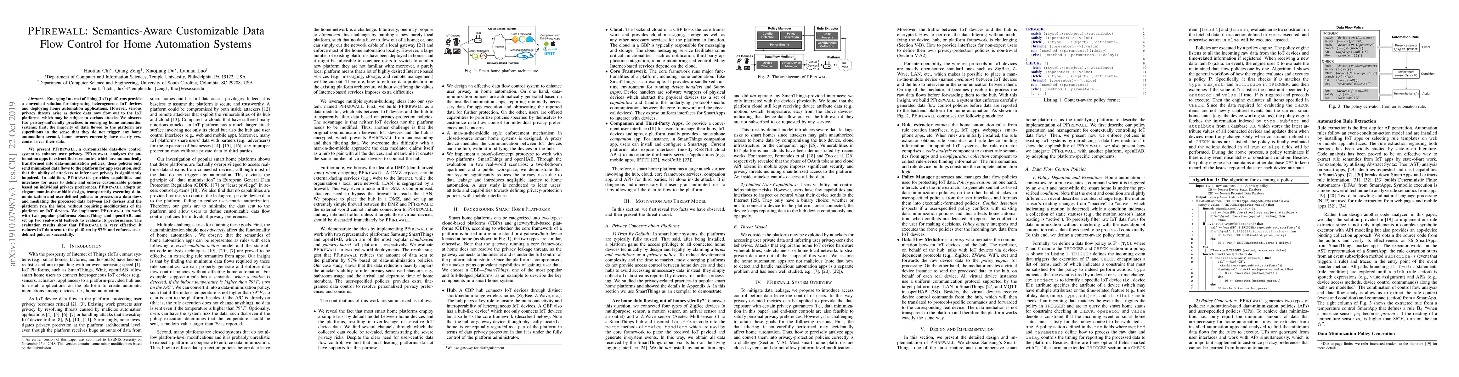 PFirewall is a customizable data-flow control system designed to enhance privacy in home automation systems by minimizing superfluous data sent to IoT platforms. It analyzes automation apps to create data-minimization policies and allows users to enforce their own privacy-focused rules, significantly reducing data leakage and improving user control over personal information.