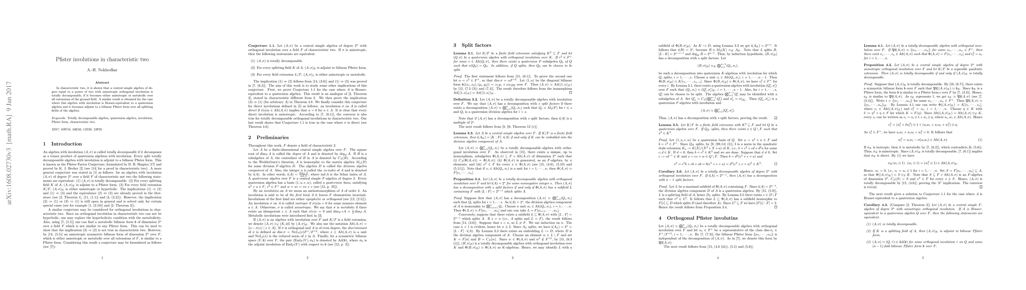 This paper demonstrates that in characteristic two, a central simple algebra of degree a power of two with an anisotropic orthogonal involution is totally decomposable if it remains anisotropic or metabolic over all field extensions. The result extends to algebras Brauer-equivalent to quaternion algebras that become adjoint to a bilinear Pfister form over all splitting fields.
