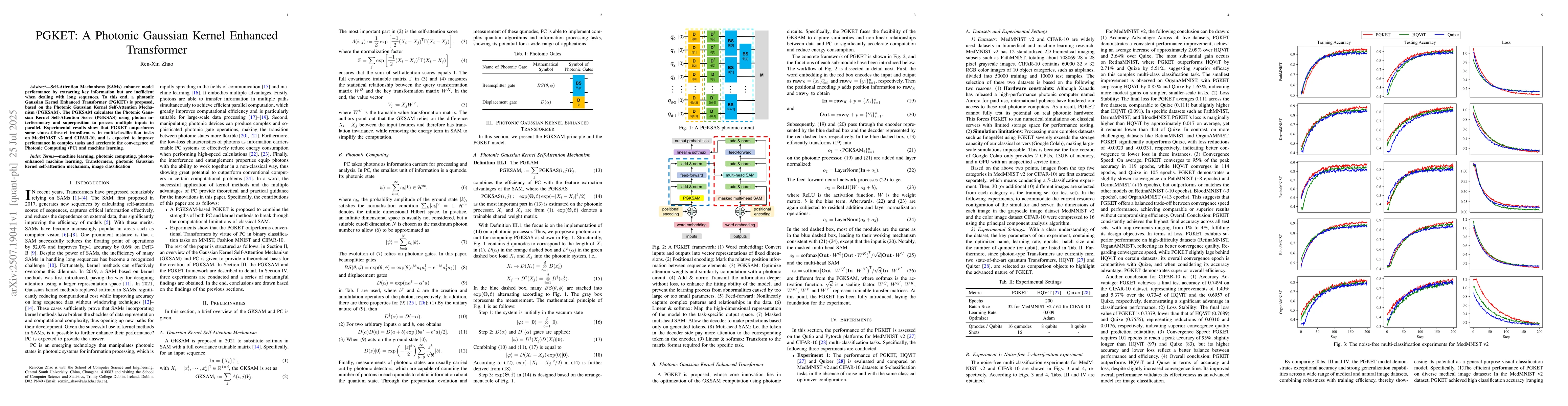 Self-Attention Mechanisms (SAMs) enhance model performance by extracting key information but are inefficient when dealing with long sequences. To this end, a photonic Gaussian Kernel Enhanced Transformer (PGKET) is proposed, based on the Photonic Gaussian Kernel Self-Attention Mechanism (PGKSAM). The PGKSAM calculates the Photonic Gaussian Kernel Self-Attention Score (PGKSAS) using photon interferometry and superposition to process multiple inputs in parallel. Experimental results show that PGKET outperforms some state-of-the-art transformers in multi-classification tasks on MedMNIST v2 and CIFAR-10, and is expected to improve performance in complex tasks and accelerate the convergence of Photonic Computing (PC) and machine learning.