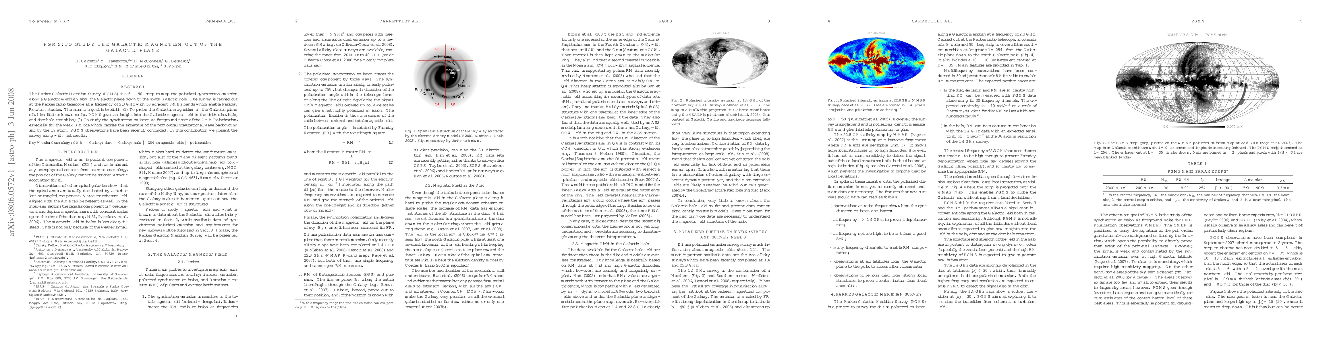The Parkes Galactic Meridian Survey (PGMS) is a 5 deg X 90 deg strip to map the polarized synchrotron emission along a Galactic meridian from the Galactic plane down to the south Galactic pole. The survey is carried out at the Parkes radio telescope at a frequency of 2.3 GHz with 30 adjacent 8-MHz bands which enable Faraday Rotation studies. The scientific goal is twofold: (1) To probe the Galactic magnetism off the Galactic plane of which little is known so far. PGMS gives an insight into the Galactic magnetic field in the thick disc, halo, and disc-halo transition; (2) To study the synchrotron emission as foreground noise of the CMB Polarization, especially for the weak B-Mode which carries the signature of the primordial gravitational wave background left by the Inflation. PGMS observations have been recently concluded. In this contribution we present the survey along with first results.
