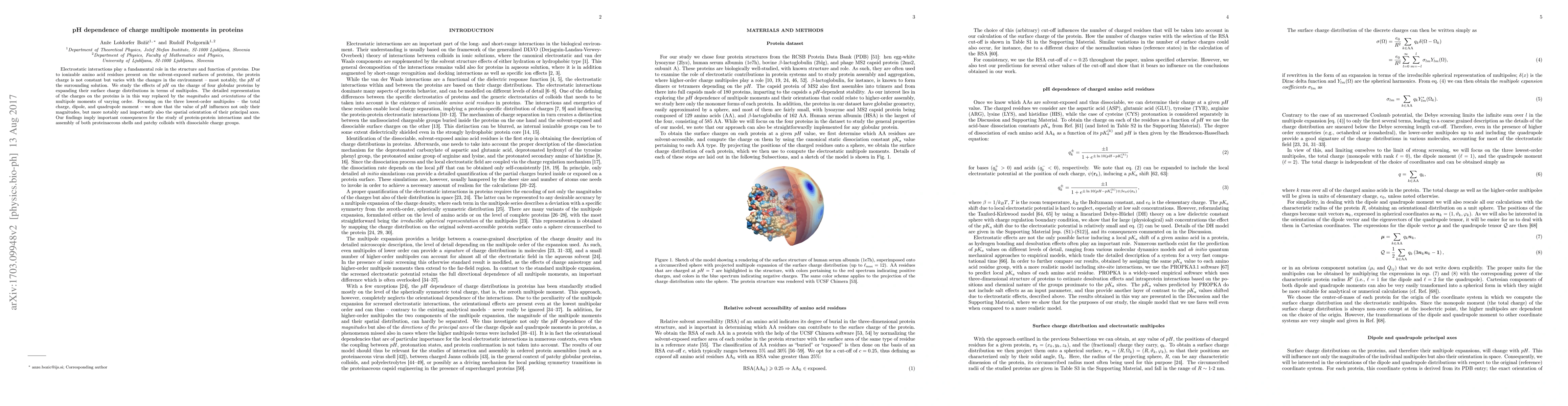 Electrostatic interactions play a fundamental role in the structure and function of proteins. Due to ionizable amino acid residues present on the solvent-exposed surfaces of proteins, the protein charge is not constant but varies with the changes in the environment -- most notably, the pH of the surrounding solution. We study the effects of pH on the charge of four globular proteins by expanding their surface charge distributions in terms of multipoles. The detailed representation of the charges on the proteins is in this way replaced by the magnitudes and orientations of the multipole moments of varying order. Focusing on the three lowest-order multipoles -- the total charge, dipole, and quadrupole moment -- we show that the value of pH influences not only their magnitudes, but more notably and importantly also the spatial orientation of their principal axes. Our findings imply important consequences for the study of protein-protein interactions and the assembly of both proteinaceous shells and patchy colloids with dissociable charge groups.