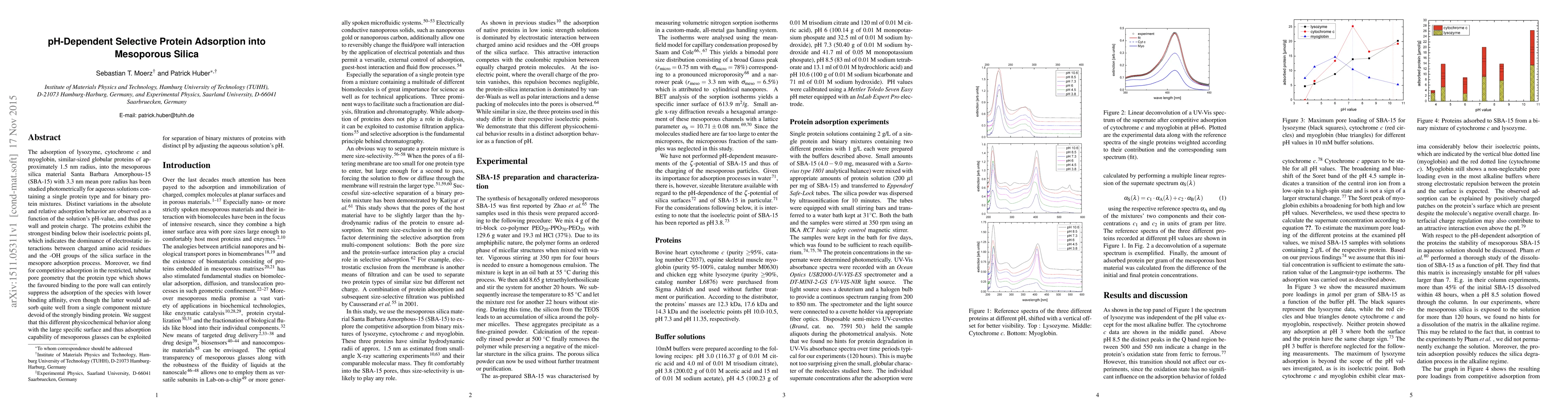 This study investigates the pH-dependent adsorption of globular proteins into mesoporous silica, revealing that electrostatic interactions dominate below the proteins' isoelectric points. The protein with the strongest binding affinity can suppress the adsorption of others in binary mixtures, suggesting potential for pH-adjusted separation of protein mixtures.