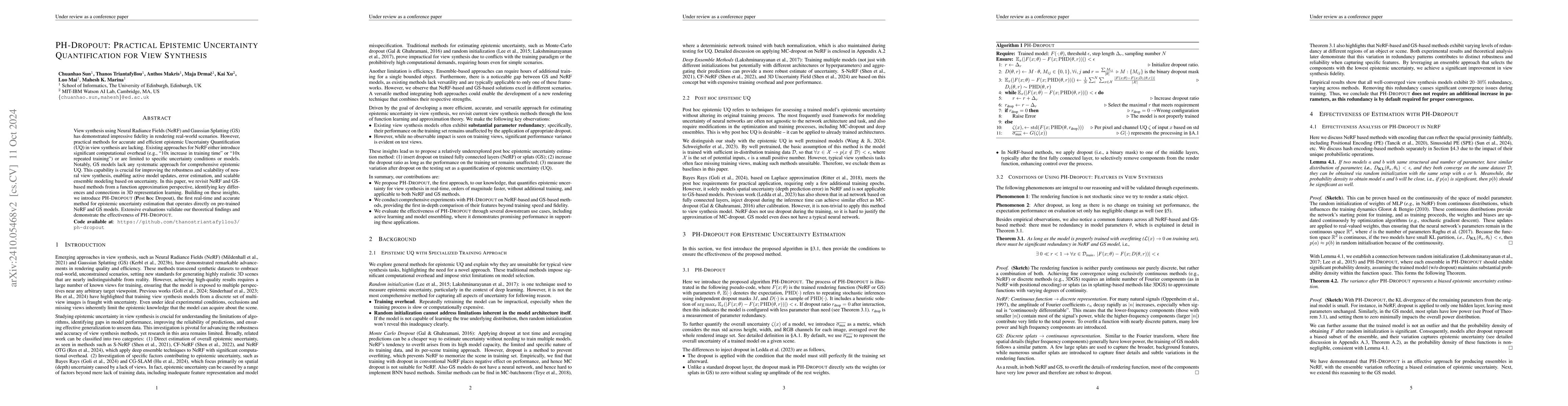 This paper introduces PH-Dropout, a method for real-time epistemic uncertainty quantification in view synthesis using Neural Radiance Fields (NeRF) and Gaussian Splatting (GS). PH-Dropout offers an efficient and accurate approach for estimating uncertainty without significant computational overhead, enabling robustness and scalability improvements in neural view synthesis.