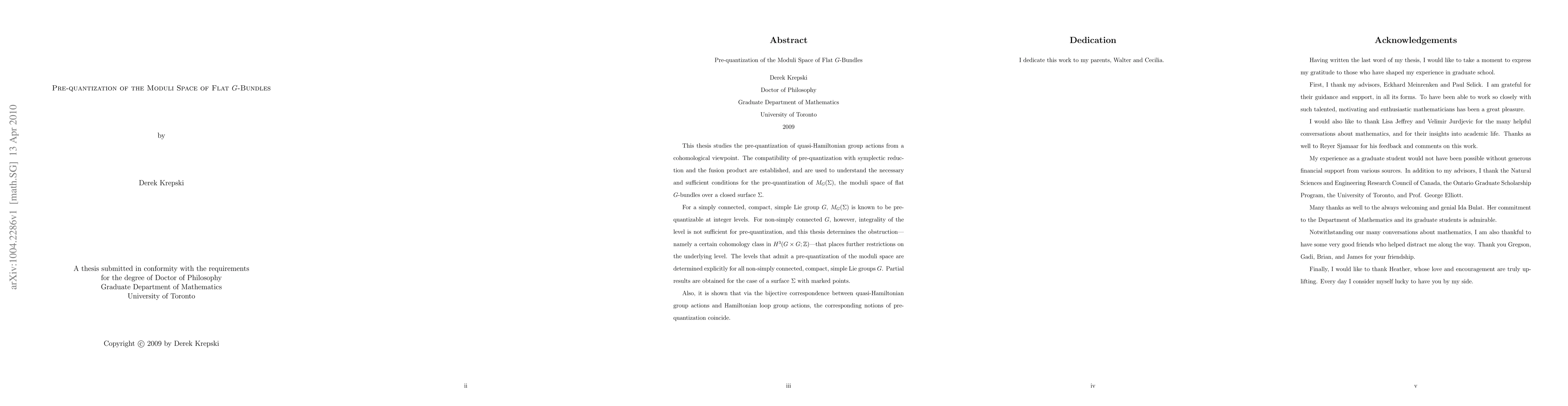 This thesis investigates the pre-quantization of quasi-Hamiltonian group actions focusing on the moduli space of flat $G$-bundles over closed surfaces, establishing conditions for pre-quantization and determining obstructions in non-simply connected groups. It identifies specific cohomology classes that restrict pre-quantization levels.