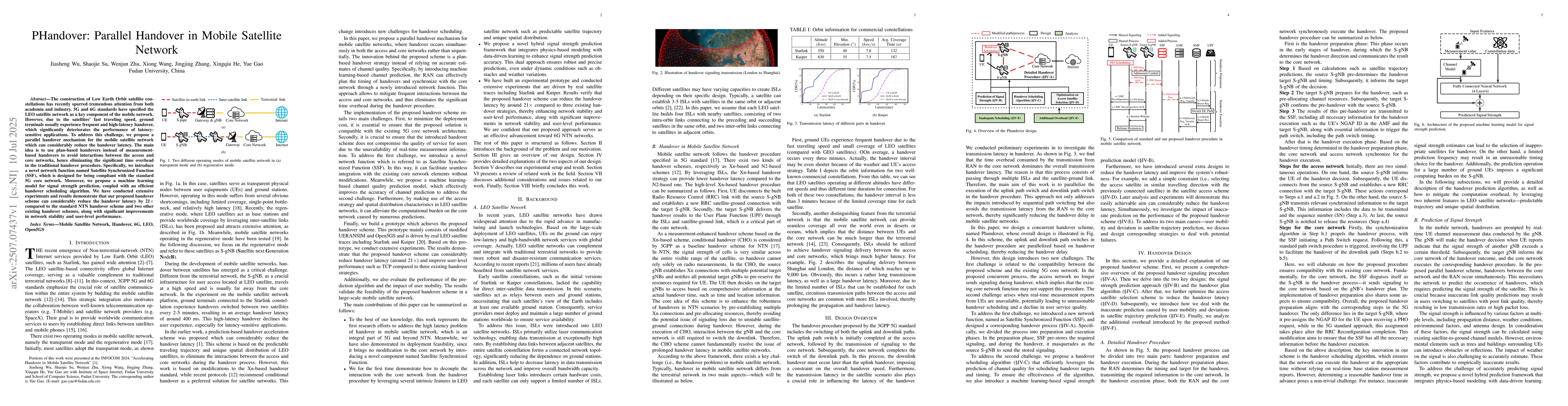 The construction of Low Earth Orbit (LEO) satellite constellations has recently attracted tremendous attention from both academia and industry. The 5G and 6G standards have identified LEO satellite networks as a key component of future mobile networks. However, due to the high-speed movement of satellites, ground terminals often experience frequent and high-latency handovers, which significantly deteriorate the performance of latency-sensitive applications. To address this challenge, we propose a parallel handover mechanism for mobile satellite networks that can considerably reduce handover latency. The main idea is to employ plan-based handovers instead of measurement-based handovers to avoid interactions between the access and core networks, thereby eliminating the significant time overhead associated with traditional handover procedures. Specifically, we introduce a novel network function named the Satellite Synchronized Function (SSF), which is designed to be fully compliant with the standard 5G core network. In addition, we propose a machine learning model for signal strength prediction, coupled with an efficient handover scheduling algorithm. We have conducted extensive experiments, and the results demonstrate that our proposed handover scheme can reduce handover latency by 21\times compared to the standard NTN handover scheme and two other existing handover approaches, along with significant improvements in network stability and user-level performance.