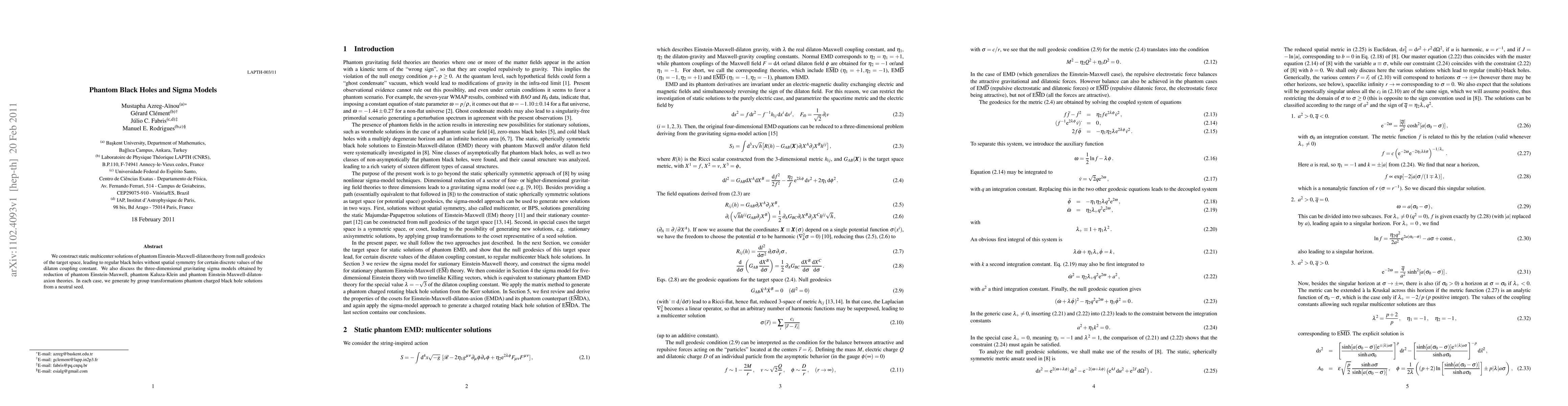 The paper presents a novel method for constructing static multicenter solutions of phantom EMD theory from null geodesics and discusses the reduction of phantom theories to three-dimensional gravitating sigma models, generating charged black hole solutions from neutral seeds via group transformations.