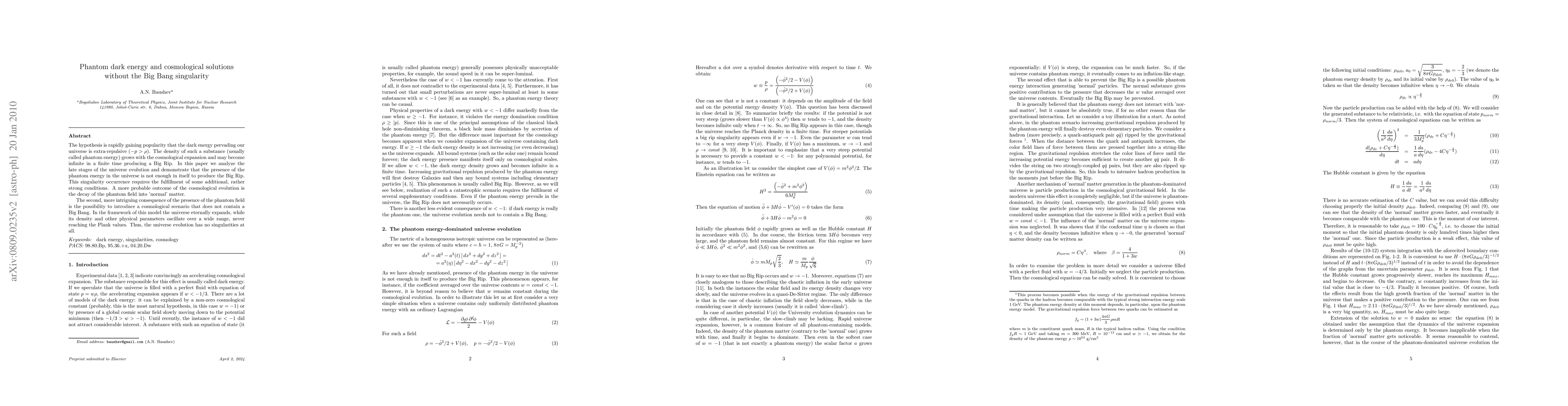 This paper explores the implications of phantom dark energy, showing that its presence does not necessarily lead to a Big Rip singularity, but rather suggests the universe could eternally expand without a Big Bang, oscillating in density without reaching Planck values.