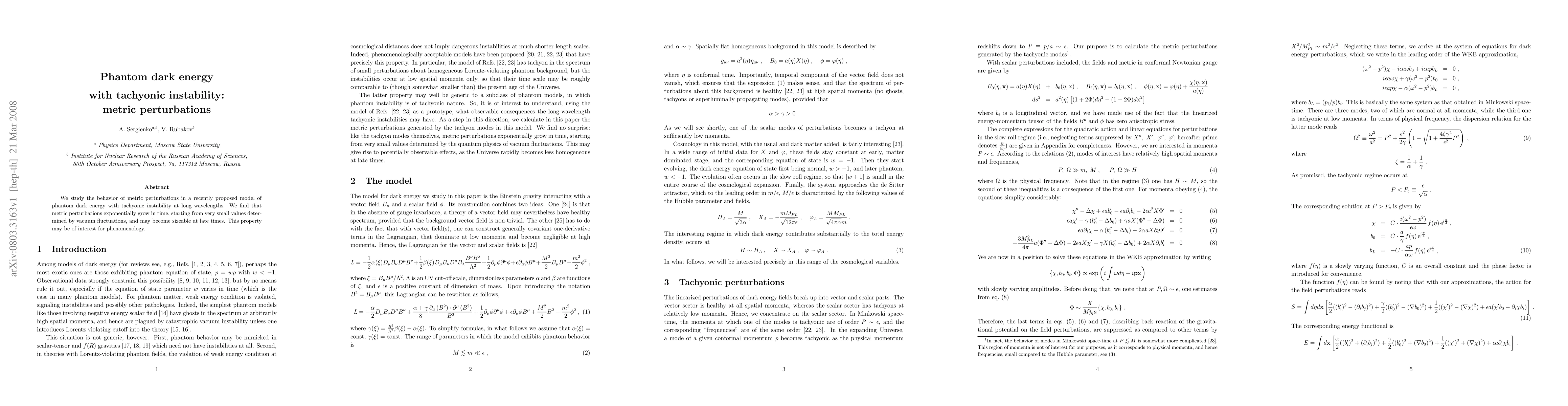 We study the behavior of metric perturbations in a recently proposed model of phantom dark energy with tachyonic instability at long wavelengths. We find that metric perturbations exponentially grow in time, starting from very small values determined by vacuum fluctuations, and may become sizeable at late times. This property may be of interest for phenomenology.