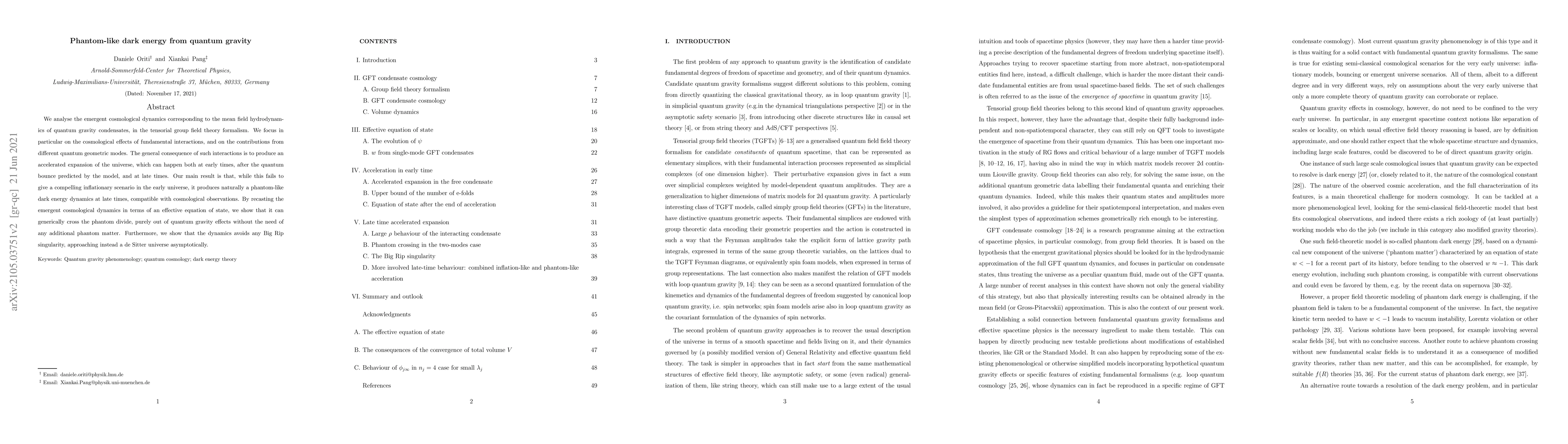 This paper explores the cosmological dynamics from quantum gravity condensates, revealing an accelerated universe expansion both early and late in its history. While it does not provide a strong inflationary model, it naturally generates phantom-like dark energy at late times, compatible with observations, and avoids a Big Rip singularity, leading instead to a de Sitter universe.