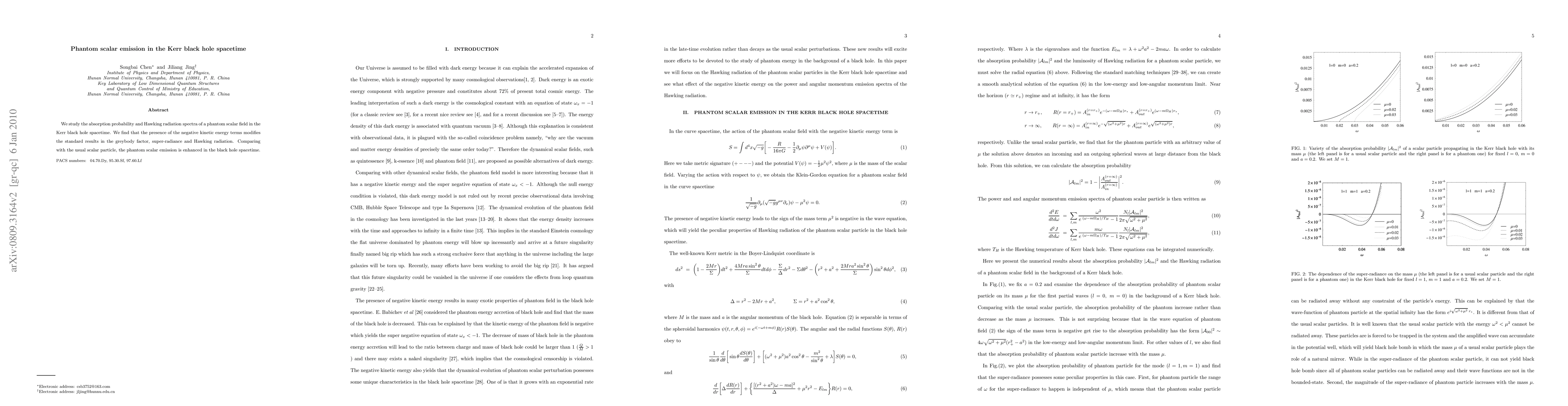 Summary: This paper investigates the emission of phantom scalar fields in the Kerr black hole spacetime, revealing that the negative kinetic energy terms enhance emission compared to standard scalar particles, altering the greybody factor, super-radiance, and Hawking radiation spectra.