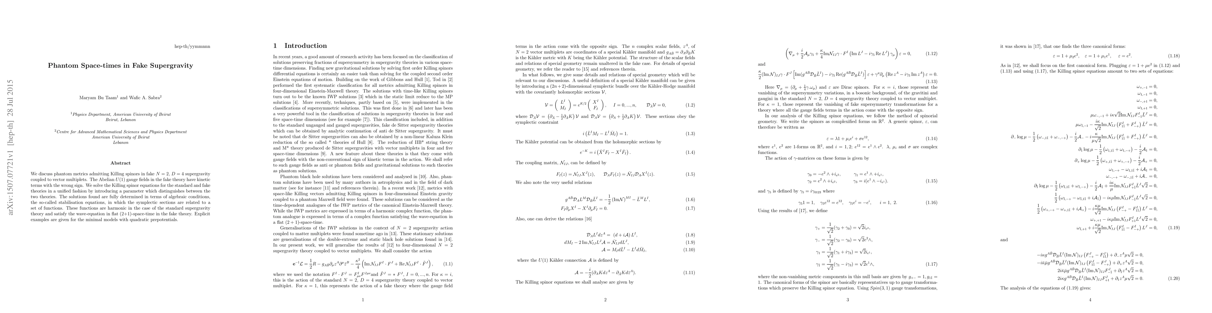 This paper explores phantom metrics in fake N=2, D=4 supergravity, focusing on solutions to the Killing spinor equations in both standard and fake theories. It introduces a parameter to distinguish between the two and derives stabilisation equations relating symplectic sections to harmonic functions in standard theory and wave-equations in flat (2+1)-space-time in the fake theory, with examples provided for minimal models.
