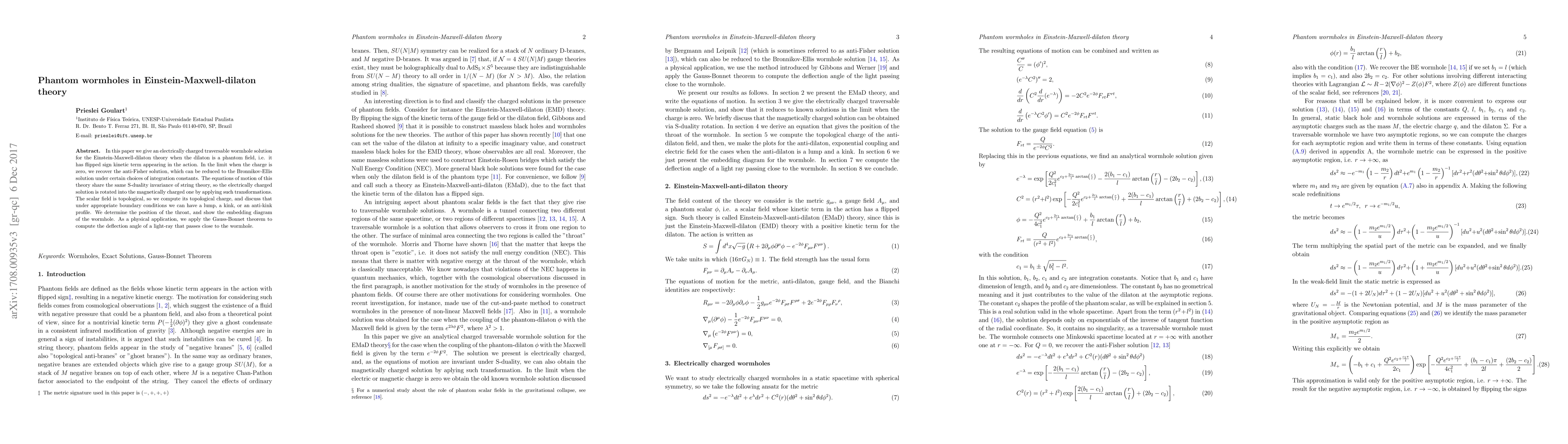 In this paper we give an electrically charged traversable wormhole solution for the Einstein-Maxwell-dilaton theory when the dilaton is a phantom field, i.e. it has flipped sign kinetic term appearing in the action. In the limit when the charge is zero, we recover the anti-Fisher solution, which can be reduced to the Bronnikov-Ellis solution under certain choices of integration constants. The equations of motion of this theory share the same S-duality invariance of string theory, so the electrically charged solution is rotated into the magnetically charged one by applying such transformations. The scalar field is topological, so we compute its topological charge, and discuss that under appropriate boundary conditions we can have a lump, a kink, or an anti-kink profile. We determine the position of the throat, and show the embedding diagram of the wormhole. As a physical application, we apply the Gauss-Bonnet theorem to compute the deflection angle of a light-ray that passes close to the wormhole.