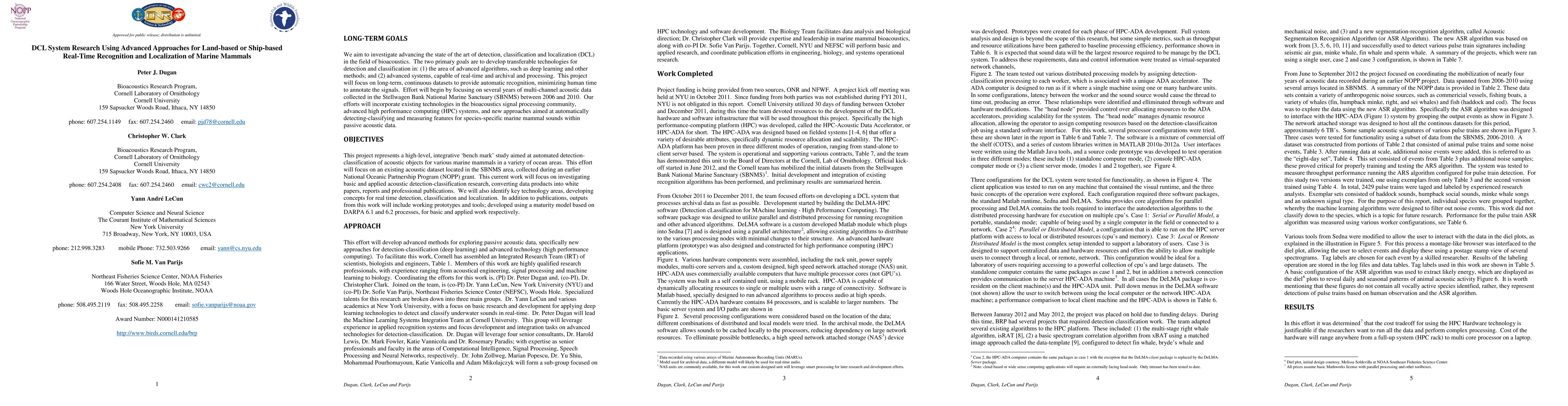 We aim to investigate advancing the state of the art of detection, classification and localization (DCL) in the field of bioacoustics. The two primary goals are to develop transferable technologies for detection and classification in: (1) the area of advanced algorithms, such as deep learning and other methods; and (2) advanced systems, capable of real-time and archival and processing. This project will focus on long-term, continuous datasets to provide automatic recognition, minimizing human time to annotate the signals. Effort will begin by focusing on several years of multi-channel acoustic data collected in the Stellwagen Bank National Marine Sanctuary (SBNMS) between 2006 and 2010. Our efforts will incorporate existing technologies in the bioacoustics signal processing community, advanced high performance computing (HPC) systems, and new approaches aimed at automatically detecting-classifying and measuring features for species-specific marine mammal sounds within passive acoustic data.