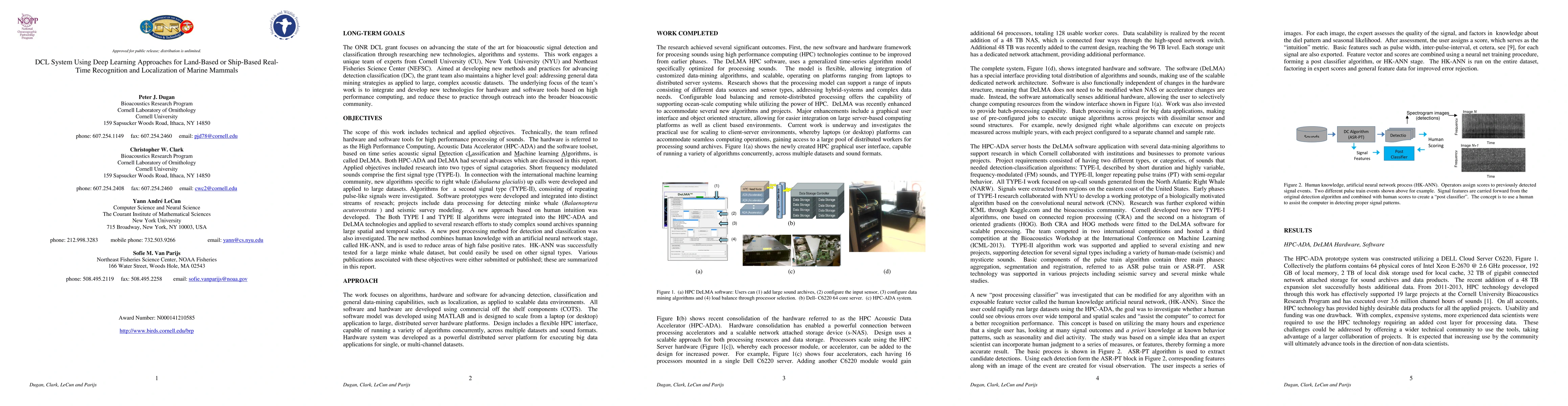Goals of this research phase is to investigate advanced detection and classification pardims useful for data-mining passive large passive acoustic archives. Technical objectives are to develop and refine a High Performance Computing, Acoustic Data Accelerator (HPC-ADA) along with MATLAB based software based on time series acoustic signal Detection cLassification using Machine learning Algorithms, called DeLMA. Data scientists and biologists integrate to use the HPC-ADA and DeLMA technologies to explore data using newly developed techniques aimed at inspection of data extracted at large spatial and temporal scales.