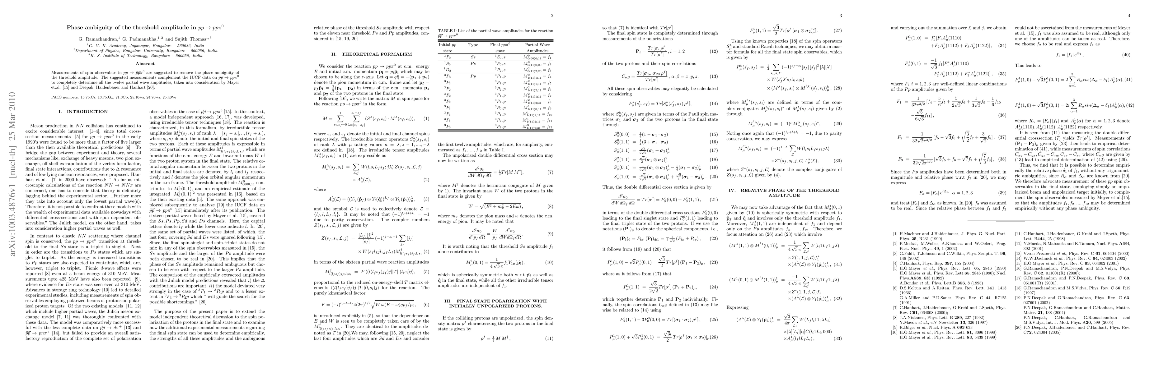Measurements of spin observables in pp -> {\vec p}{\vec p}\pi^0 are suggested to remove the phase ambiguity of the threshold amplitude. The suggested measurements complement the IUCF data on {\vec p}{\vec p} -> pp\pi^0 to completely determine all the twelve partial wave amplitudes, taken into consideration by Mayer et.al. [15] and Deepak, Haidenbauer and Hanhart [20].