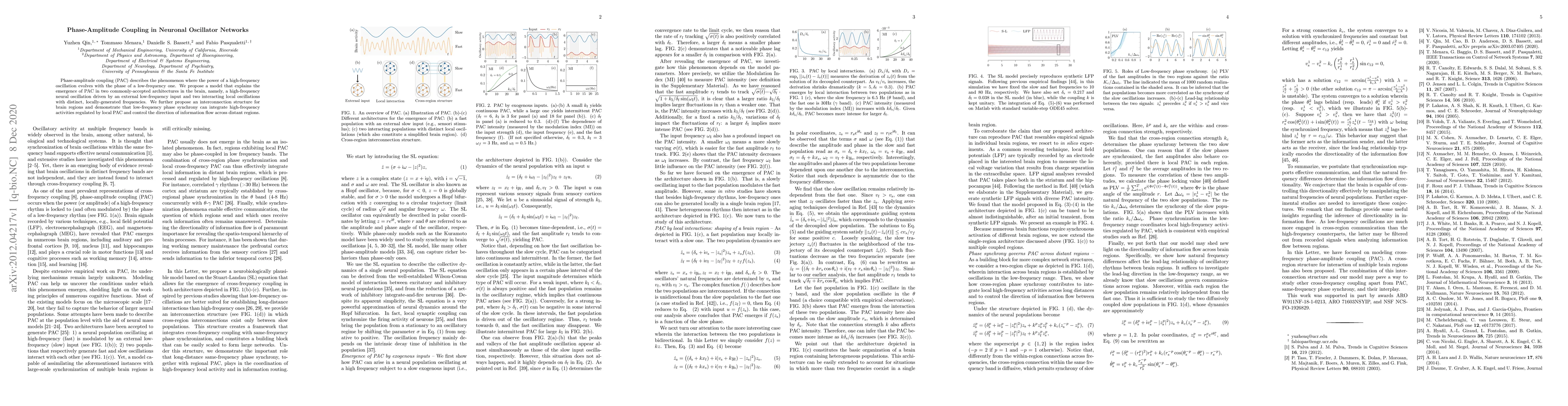Phase-amplitude coupling (PAC) describes the phenomenon where the power of a high-frequency oscillation evolves with the phase of a low-frequency one. We propose a model that explains the emergence of PAC in two commonly-accepted architectures in the brain, namely, a high-frequency neural oscillation driven by an external low-frequency input and two interacting local oscillations with distinct, locally-generated frequencies. We further propose an interconnection structure for brain regions and demonstrate that low-frequency phase synchrony can integrate high-frequency activities regulated by local PAC and control the direction of information flow across distant regions.
