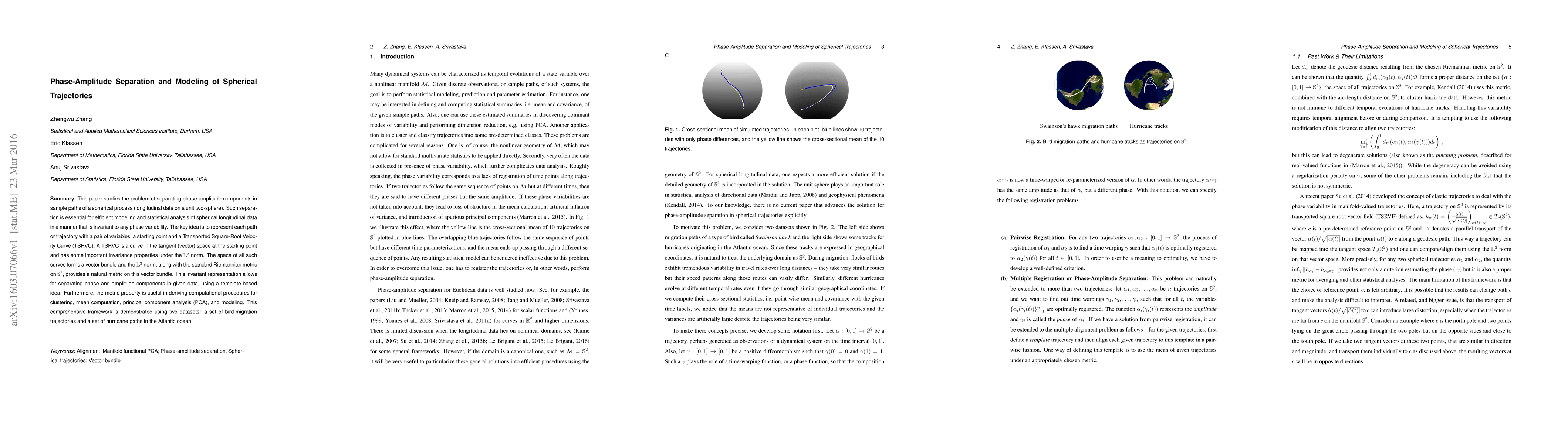 This paper studies the problem of separating phase-amplitude components in sample paths of a spherical process (longitudinal data on a unit two-sphere). Such separation is essential for efficient modeling and statistical analysis of spherical longitudinal data in a manner that is invariant to any phase variability. The key idea is to represent each path or trajectory with a pair of variables, a starting point and a Transported Square-Root Velocity Curve (TSRVC). A TSRVC is a curve in the tangent (vector) space at the starting point and has some important invariance properties under the L2 norm. The space of all such curves forms a vector bundle and the L2 norm, along with the standard Riemannian metric on S2, provides a natural metric on this vector bundle. This invariant representation allows for separating phase and amplitude components in given data, using a template-based idea. Furthermore, the metric property is useful in deriving computational procedures for clustering, mean computation, principal component analysis (PCA), and modeling. This comprehensive framework is demonstrated using two datasets: a set of bird-migration trajectories and a set of hurricane paths in the Atlantic ocean.