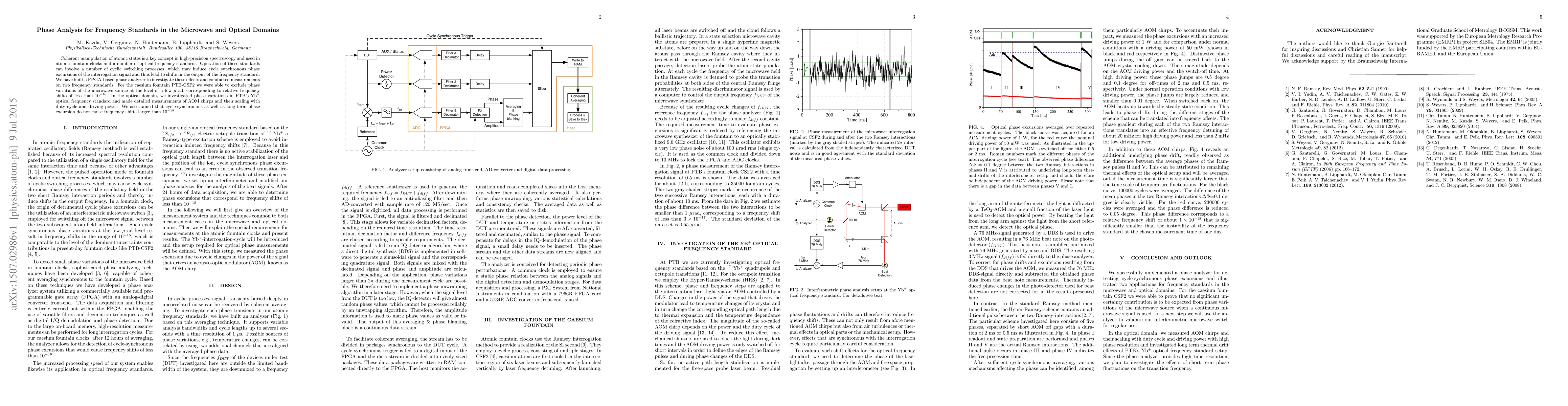 This paper presents a FPGA-based phase analyzer for investigating phase excursions in microwave and optical frequency standards, finding negligible phase variations in both caesium and Yb$^+$ standards, corresponding to relative frequency shifts below 10$^{-16}$ and 10$^{-18}$ respectively.
