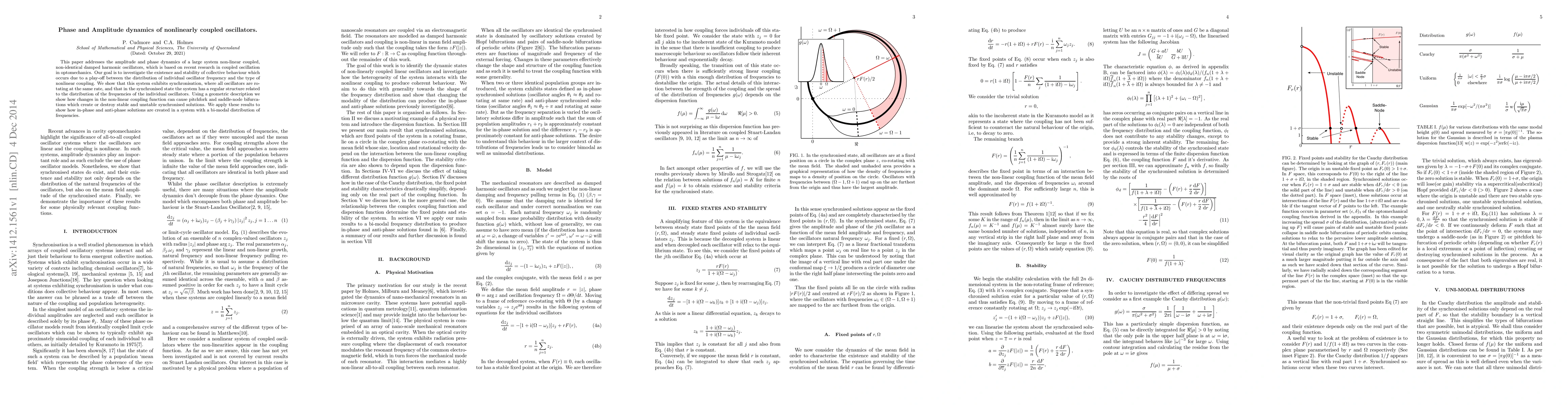 This paper addresses the amplitude and phase dynamics of a large system non-linear coupled, non-identical damped harmonic oscillators, which is based on recent research in coupled oscillation in optomechanics. Our goal is to investigate the existence and stability of collective behaviour which occurs due to a play-off between the distribution of individual oscillator frequency and the type of nonlinear coupling. We show that this system exhibits synchronisation, where all oscillators are rotating at the same rate, and that in the synchronised state the system has a regular structure related to the distribution of the frequencies of the individual oscillators. Using a geometric description we show how changes in the non-linear coupling function can cause pitchfork and saddle-node bifurcations which create or destroy stable and unstable synchronised solutions. We apply these results to show how in-phase and anti-phase solutions are created in a system with a bi-modal distribution of frequencies.