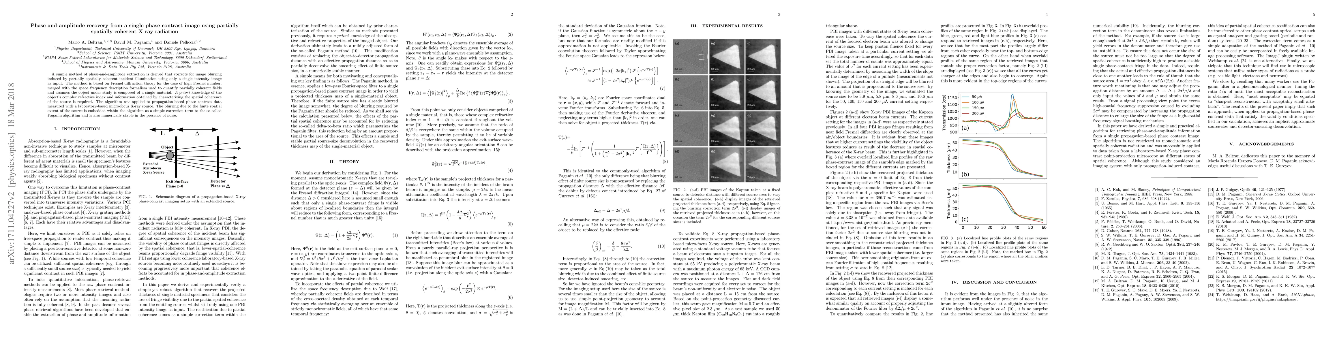 This paper proposes a method for extracting phase and amplitude information from a single phase contrast X-ray image using partially spatially coherent radiation. The approach combines Fresnel diffraction theory with space-frequency formalism to correct for blurring, requiring knowledge of the object's refractive index and source coherence characterization.