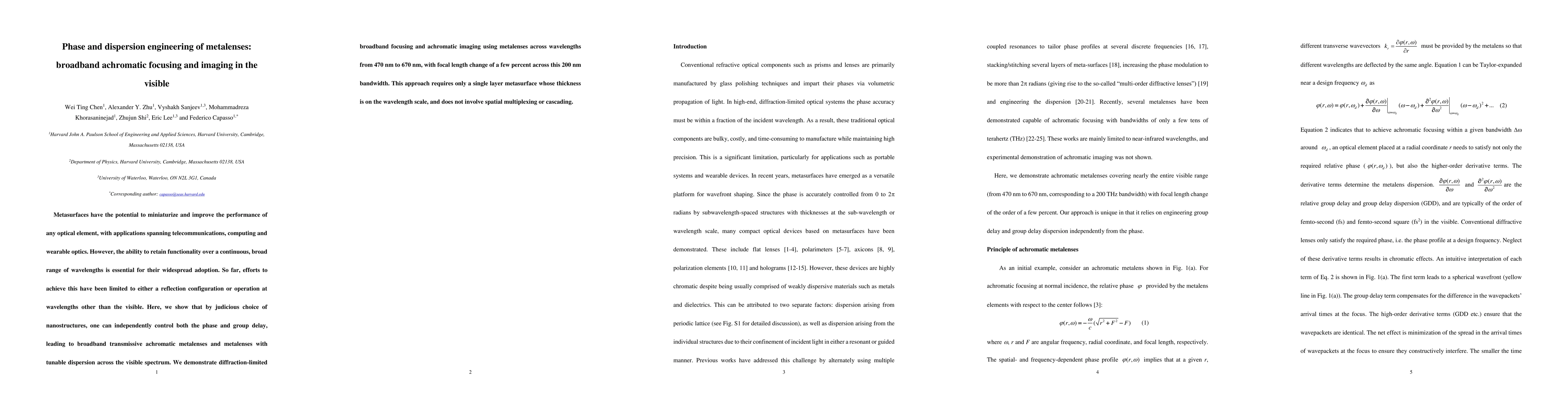 This paper presents a method for designing broadband transmissive achromatic metalenses using nanostructures to independently control phase and group delay, enabling diffraction-limited focusing and achromatic imaging across the visible spectrum from 470 nm to 670 nm without requiring multiple layers or spatial multiplexing.