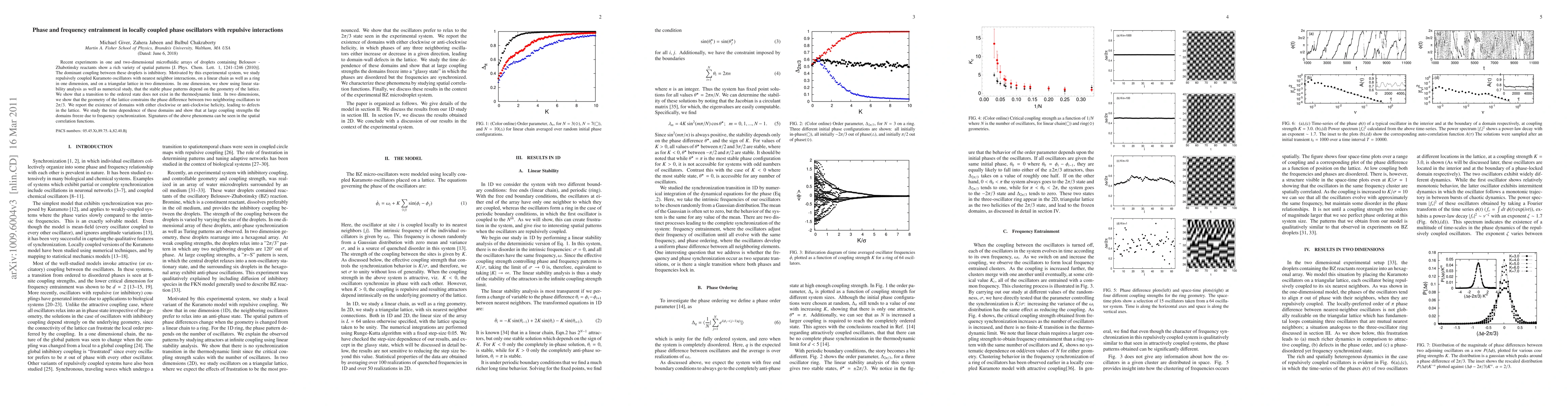 Recent experiments in one and two-dimensional microfluidic arrays of droplets containing Belousov -Zhabotinsky reactants show a rich variety of spatial patterns [J. Phys. Chem. Lett. 1, 1241-1246 (2010)]. The dominant coupling between these droplets is inhibitory. Motivated by this experimental system, we study repulsively coupled Kuramoto oscillators with nearest neighbor interactions, on a linear chain as well as a ring in one dimension, and on a triangular lattice in two dimensions. In one dimension, we show using linear stability analysis as well as numerical study, that the stable phase patterns depend on the geometry of the lattice. We show that a transition to the ordered state does not exist in the thermodynamic limit. In two dimensions, we show that the geometry of the lattice constrains the phase difference between two neighbouring oscillators to 120 degrees. We report the existence of domains with either clockwise or anti-clockwise helicity, leading to defects in the lattice. We study the time dependence of these domains and show that at large coupling strengths, the domains freeze due to frequency synchronization. Signatures of the above phenomena can be seen in the spatial correlation functions.