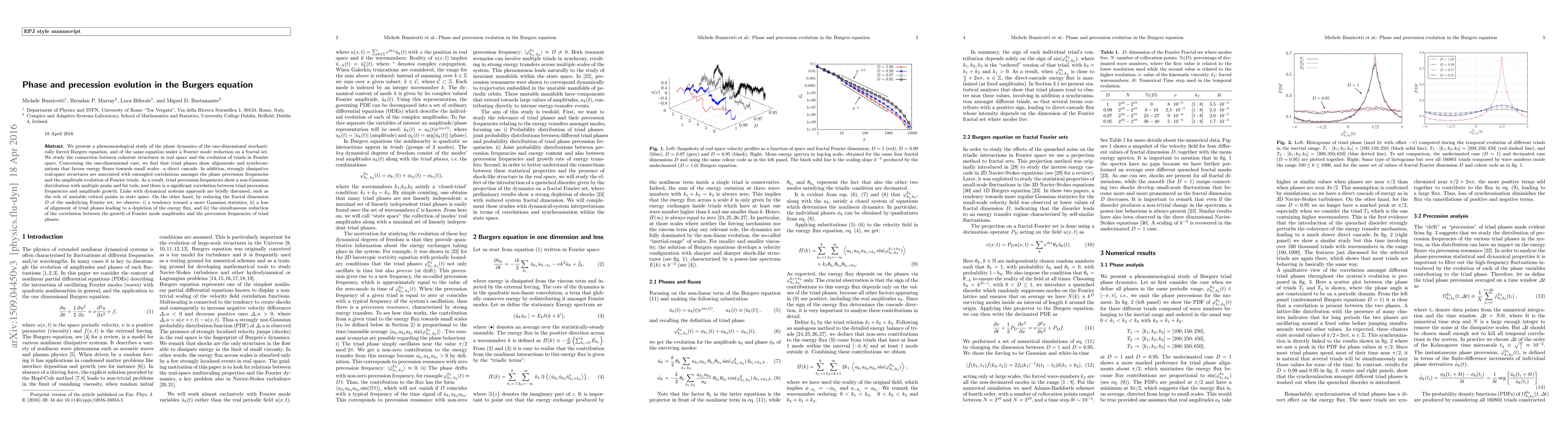 We present a phenomenological study of the phase dynamics of the one-dimensional stochastically forced Burgers equation, and of the same equation under a Fourier mode reduction on a fractal set. We study the connection between coherent structures in real space and the evolution of triads in Fourier space. Concerning the one-dimensional case, we find that triad phases show alignments and synchronisations that favour energy fluxes towards small scales --a direct cascade. In addition, strongly dissipative real-space structures are associated with entangled correlations amongst the phase precession frequencies and the amplitude evolution of Fourier triads. As a result, triad precession frequencies show a non-Gaussian distribution with multiple peaks and fat tails, and there is a significant correlation between triad precession frequencies and amplitude growth. Links with dynamical systems approach are briefly discussed, such as the role of unstable critical points in state space. On the other hand, by reducing the fractal dimension $D$ of the underlying Fourier set, we observe: i) a tendency toward a more Gaussian statistics, ii) a loss of alignment of triad phases leading to a depletion of the energy flux, and iii) the simultaneous reduction of the correlation between the growth of Fourier mode amplitudes and the precession frequencies of triad phases.