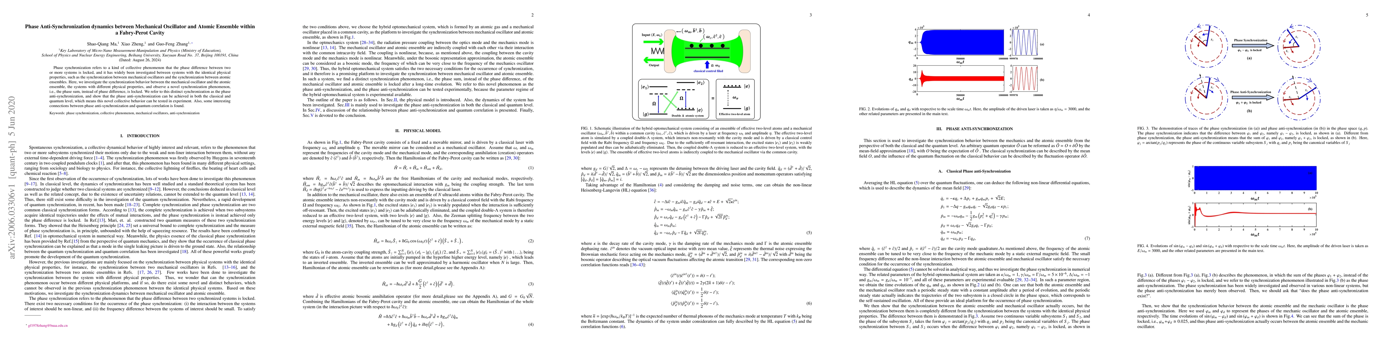 This paper investigates phase anti-synchronization dynamics between a mechanical oscillator and an atomic ensemble within a Fabry-Perot cavity, revealing a novel synchronization phenomenon where the phase sum is locked instead of the phase difference. The study demonstrates this behavior at both classical and quantum levels, highlighting potential experimental testability and connections to quantum correlations.