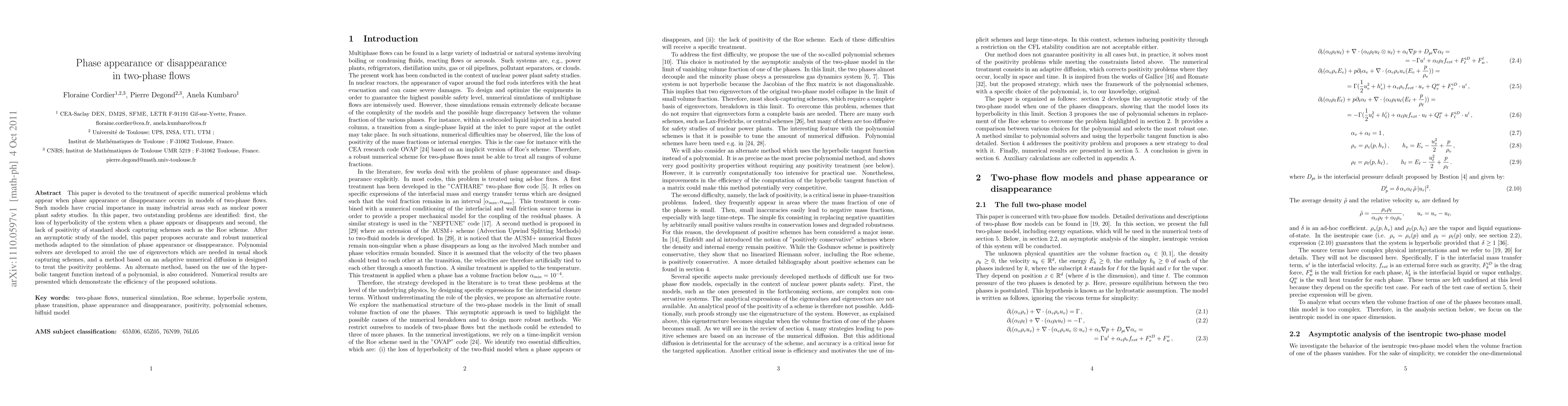 This paper is devoted to the treatment of specific numerical problems which appear when phase appearance or disappearance occurs in models of two-phase flows. Such models have crucial importance in many industrial areas such as nuclear power plant safety studies. In this paper, two outstanding problems are identified: first, the loss of hyperbolicity of the system when a phase appears or disappears and second, the lack of positivity of standard shock capturing schemes such as the Roe scheme. After an asymptotic study of the model, this paper proposes accurate and robust numerical methods adapted to the simulation of phase appearance or disappearance. Polynomial solvers are developed to avoid the use of eigenvectors which are needed in usual shock capturing schemes, and a method based on an adaptive numerical diffusion is designed to treat the positivity problems. An alternate method, based on the use of the hyperbolic tangent function instead of a polynomial, is also considered. Numerical results are presented which demonstrate the efficiency of the proposed solutions.