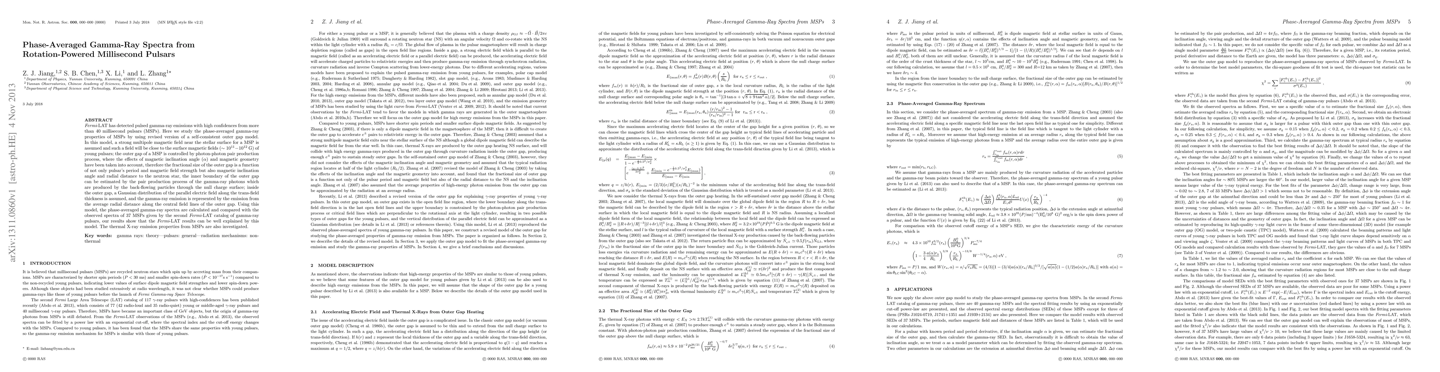 This research uses a revised outer gap model to explain the phase-averaged gamma-ray spectra of 37 millisecond pulsars (MSPs) detected by Fermi-LAT. The model considers magnetic field strength, inclination angle, and geometry, successfully matching observed spectra. It also investigates thermal X-ray emission properties from MSPs.