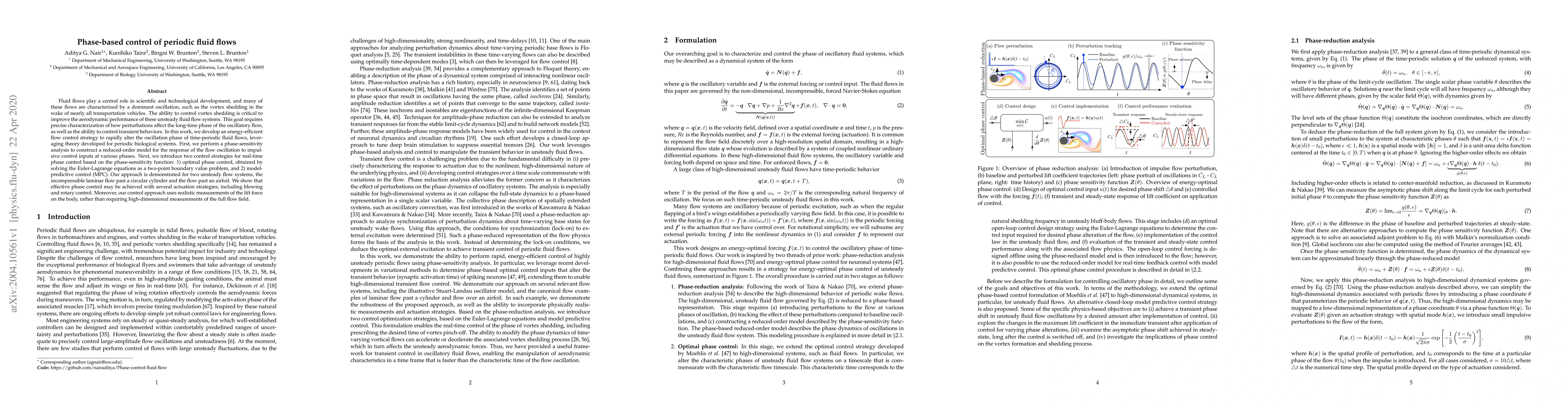 This paper develops an energy-efficient strategy for controlling the phase of periodic fluid flows, such as vortex shedding, using reduced-order models and phase-sensitivity analysis. It demonstrates two control methods—optimal phase control and model-predictive control—applied to flows past a cylinder and an airfoil, showing effective phase control with minimal measurement requirements.