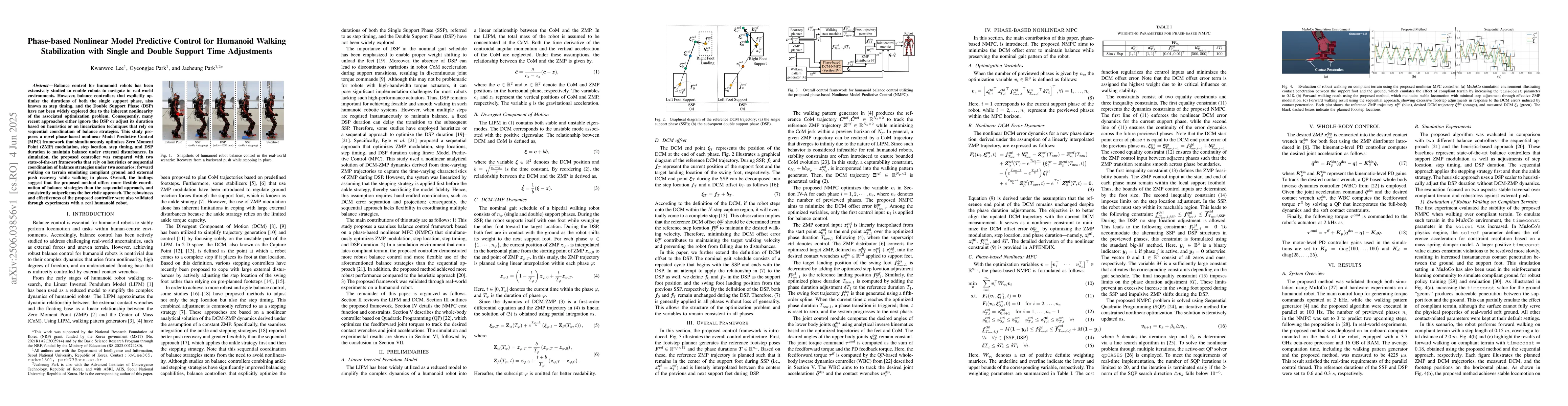 The development of a phase-based nonlinear MPC framework for simultaneous optimization of ZMP, step location, step timing, and DSP duration in humanoid walking.
