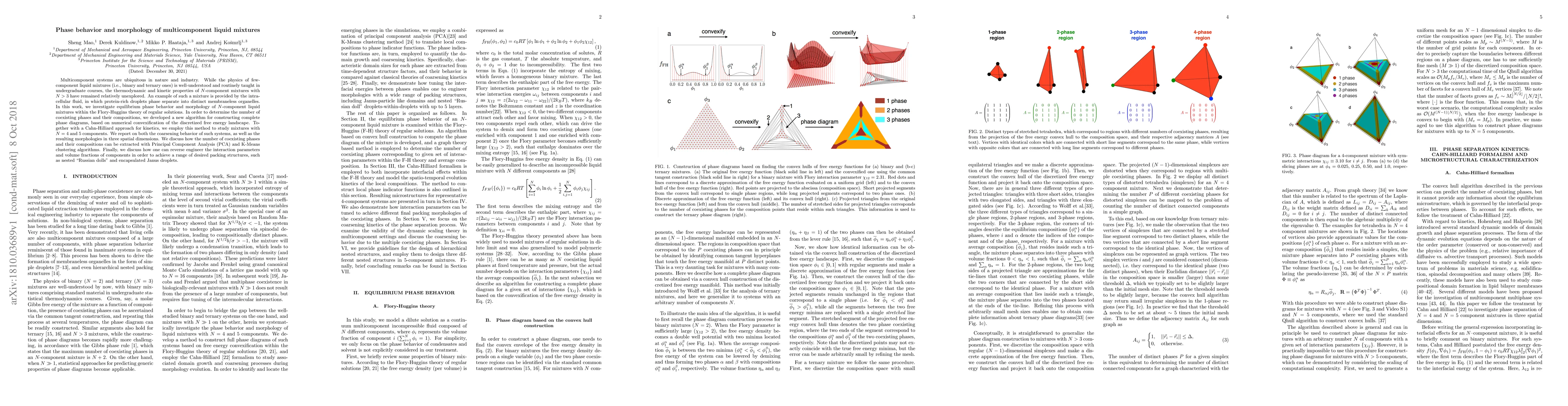 This paper explores the phase behavior and morphology of multicomponent liquid mixtures with $N>3$ components using the Flory-Huggins theory. The authors develop a new algorithm to construct complete phase diagrams and study the coarsening behavior and morphologies of $N=4$ and $5$ component mixtures, employing PCA and K-Means for analysis and demonstrating methods to achieve desired packing structures.