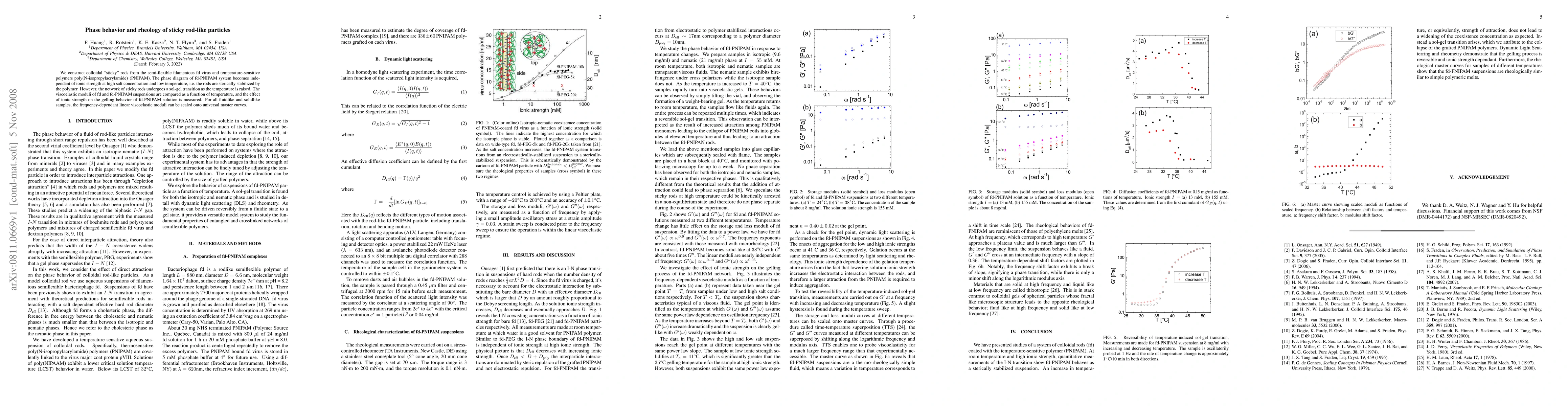 We construct colloidal ``sticky'' rods from the semi-flexible filamentous fd virus and temperature-sensitive polymers poly(N-isopropylacrylamide) (PNIPAM). The phase diagram of fd-PNIPAM system becomes independent of ionic strength at high salt concentration and low temperature, i.e. the rods are sterically stabilized by the polymer. However, the network of sticky rods undergoes a sol-gel transition as the temperature is raised. The viscoelastic moduli of fd and fd-PNIPAM suspensions are compared as a function of temperature, and the effect of ionic strength on the gelling behavior of fd-PNIPAM solution is measured. For all fluidlike and solidlike samples, the frequency-dependant linear viscoelastic moduli can be scaled onto universal master curves.